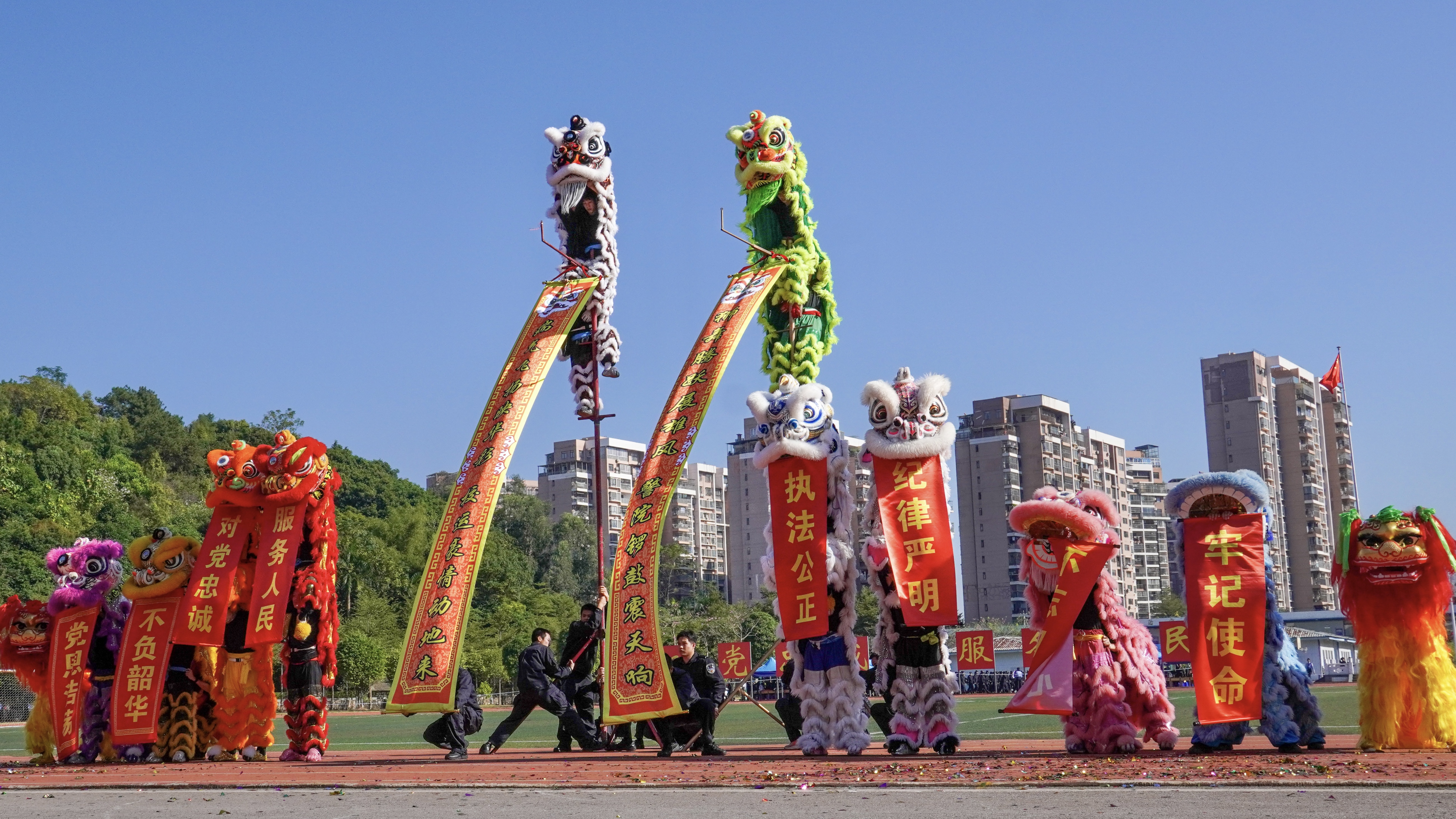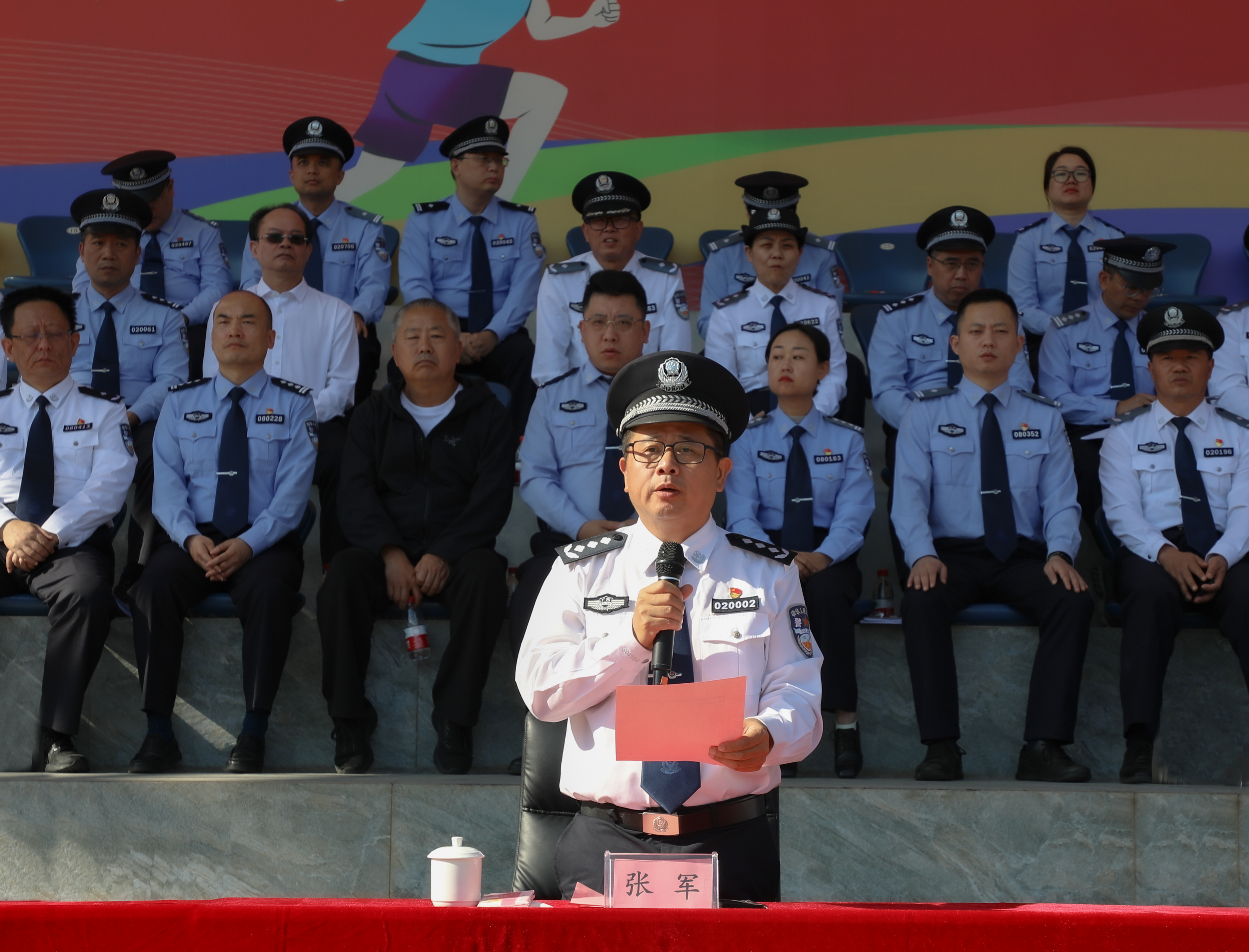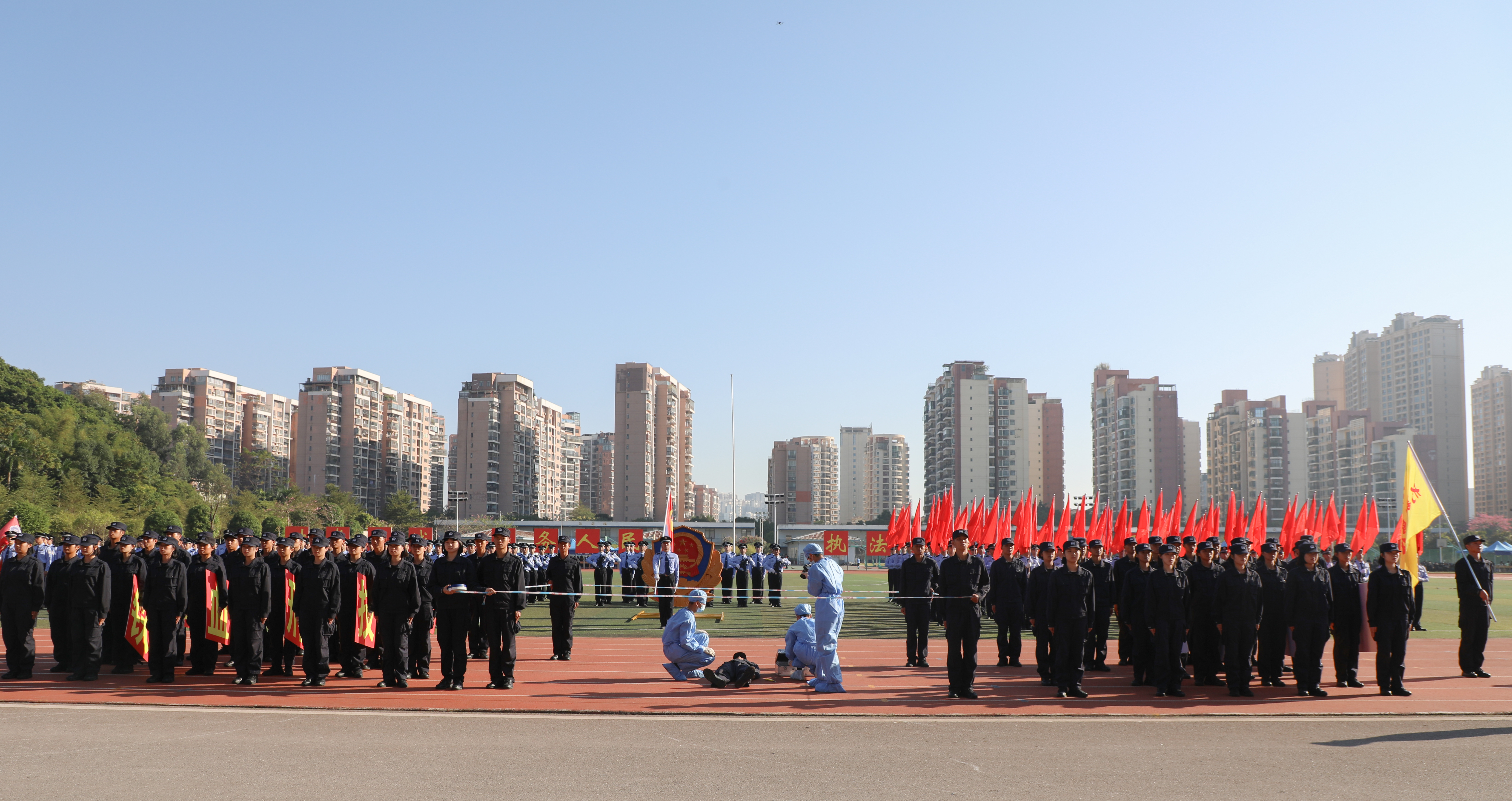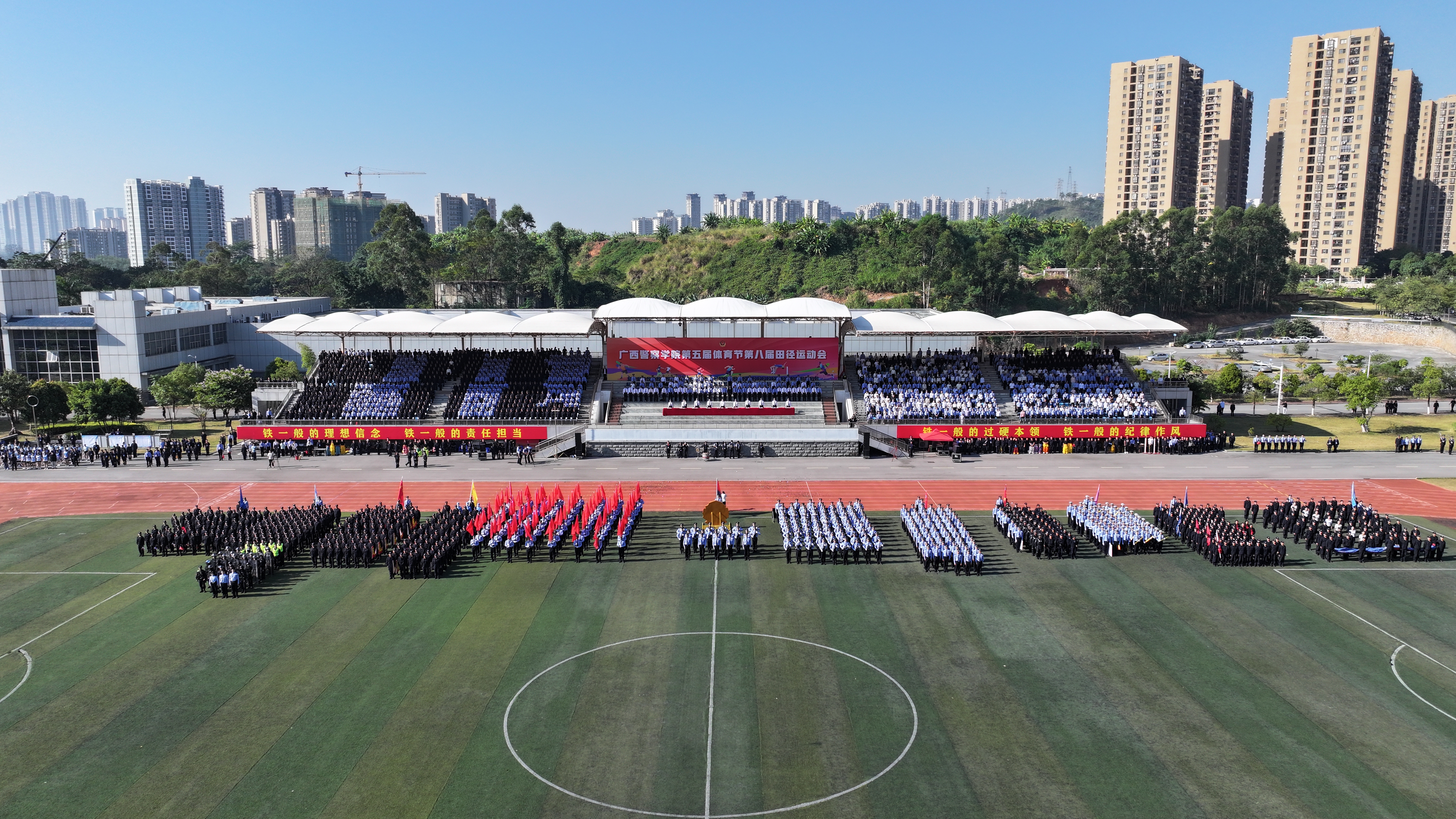 在运动员入场环节,伴随着昂扬的进行曲,国旗、警旗、警徽方阵率先迈着铿锵的步伐,昂首阔步朝主席台走来。会标方阵、红旗方块队、裁判方块队和9个二级学院方块队依次入场。整齐的队伍、有力的步伐、响亮的口号、充满创意的入场表演,展现了师生昂扬向上的精神面貌,赢得了阵阵掌声。