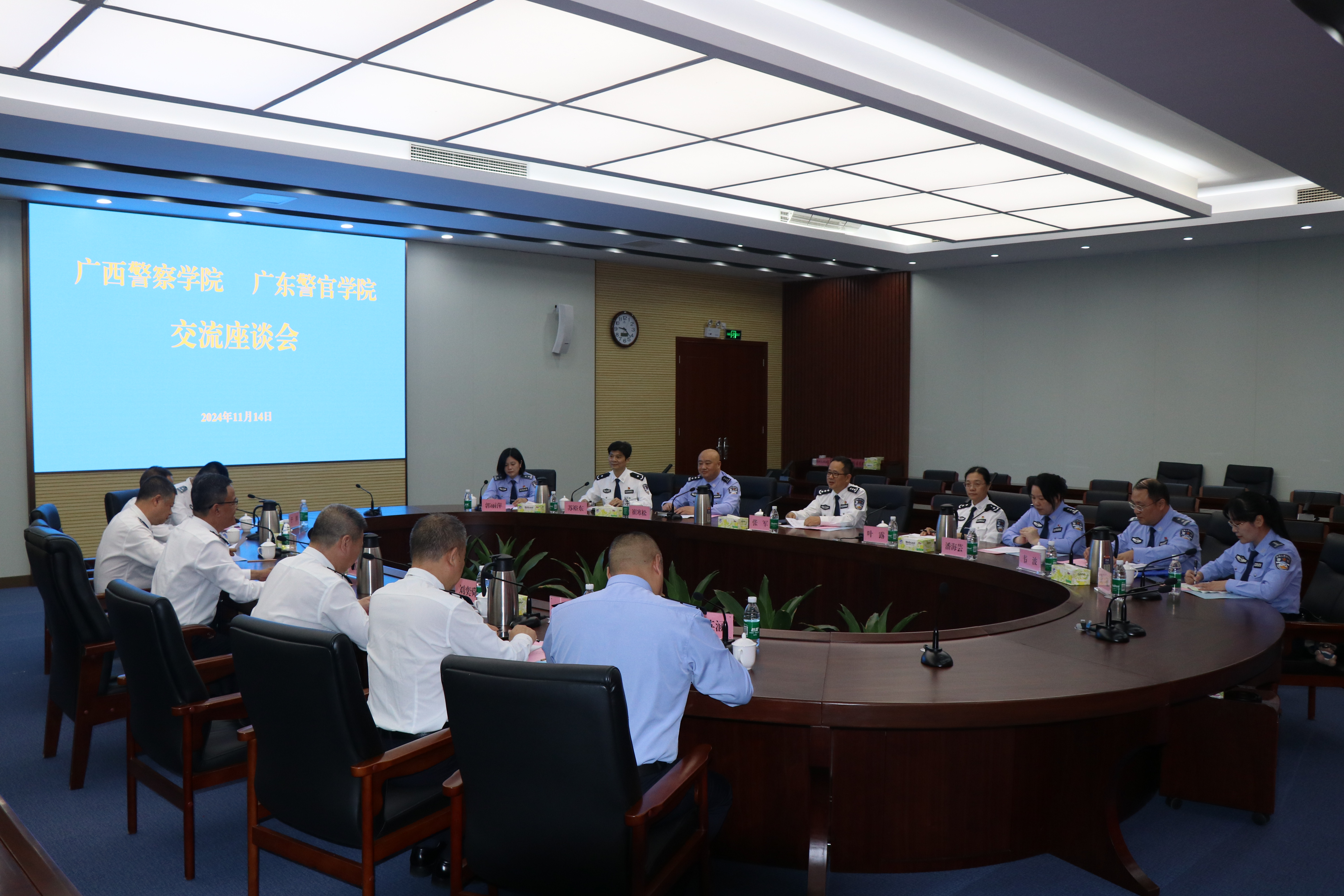 11月14日,张军一行到访广东警官学院。双方围绕科研机构管理运行、国际交流合作、在职民警培训、外警培训;二级机构绩效分配和社会服务创收、国有资本(资产)监督管理;硕士点申报和建设;高层次人才培养与引进等方面工作进行深入交流。双方一致表示,将继续深化各领域交流合作,共同推动公安高等教育高质量发展。