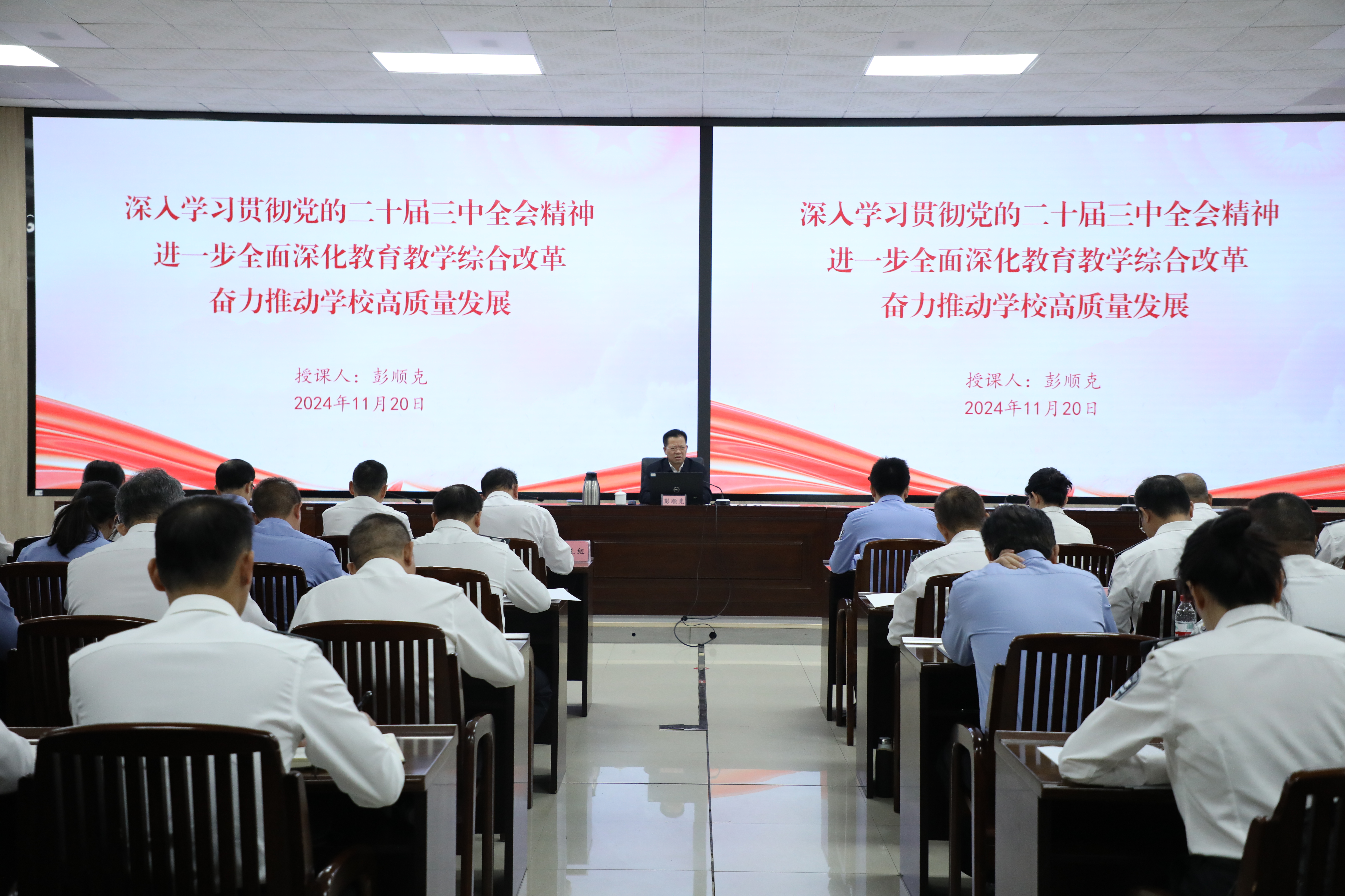本次专题培训班设专题辅导、座谈研讨、现场教学等环节。在专题辅导环节,学校党委书记彭顺克紧密结合当前学校工作实际,以《深入学习贯彻党的二十届三中全会精神 进一步全面深化教育教学综合改革 奋力推动学校高质量发展》为题作培训班首场专题讲座,从深入学习把握党的二十届三中全会的丰富内涵和全会关于教育工作、公安工作的重要部署,推动全会精神在学校落地落实等方面进行讲授。