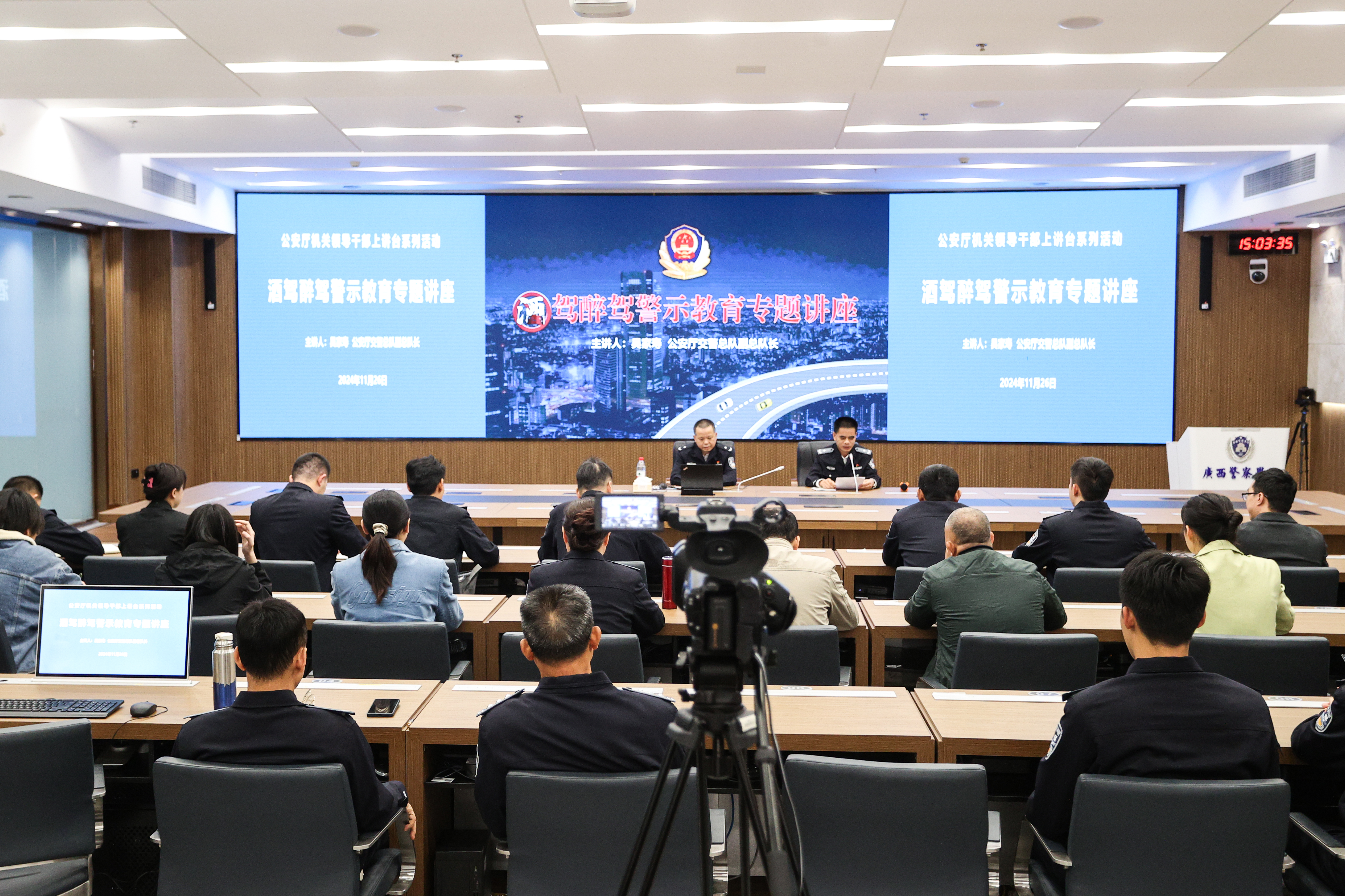 吴家寿作酒驾醉驾警示教育专题讲座,他介绍了近年来我区查处酒驾醉驾基本情况、我国现行的酒驾醉驾法律规定及相关处罚措施,提出坚持整治方式从短期集中整治向常态化整治转变、公职人员酒驾醉驾严厉筛查追责、家庭互助监督等解决方案,阐述了广西公安机关打击治理酒驾醉驾违法行为的实践,并告诫同学们要时刻牢记法律底线,为构建安全有序的道路交通环境、维护队伍良好形象贡献力量。