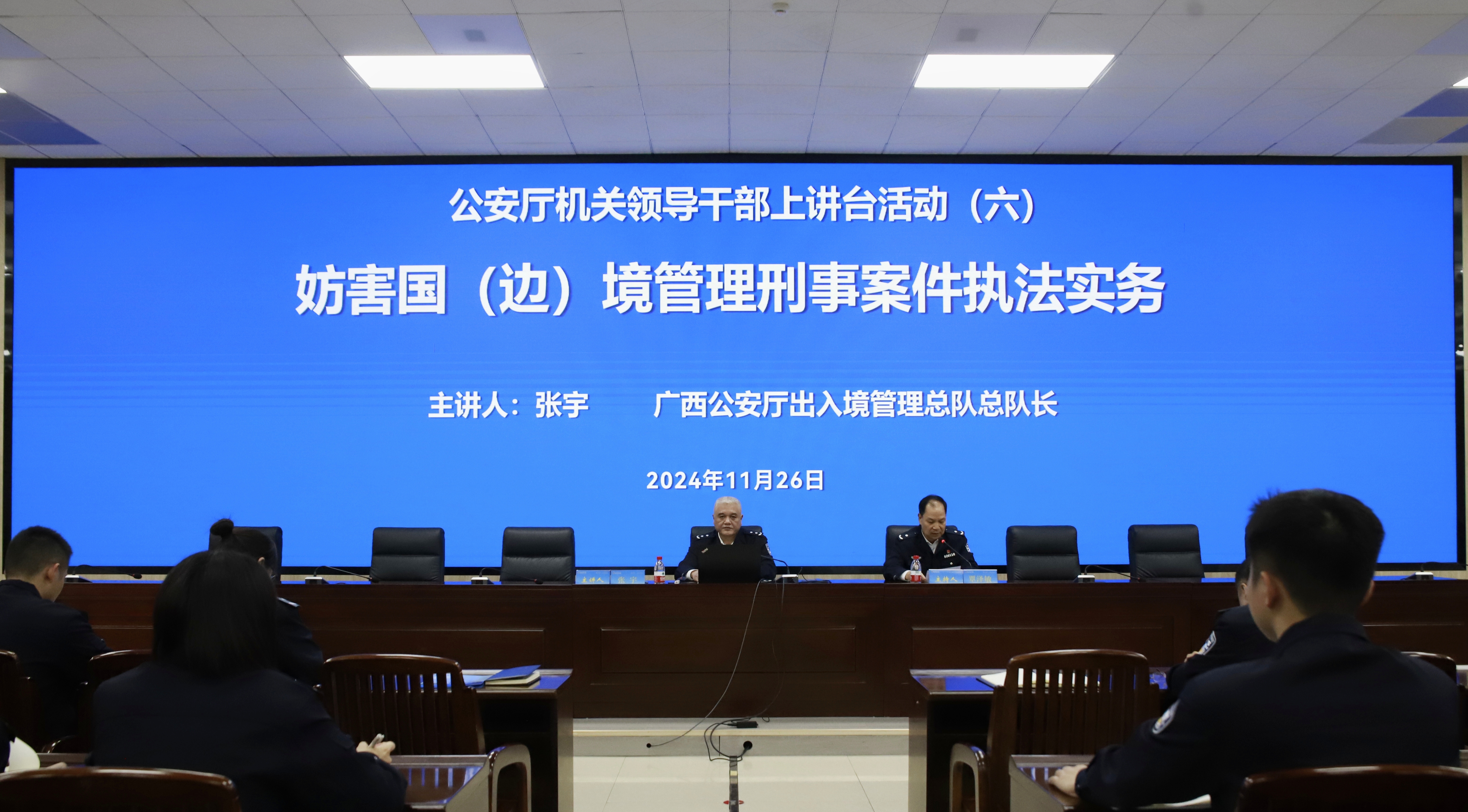 张宇以《妨害国(边)境管理刑事案件执法实务》为题,从我区近阶段妨害国(边)境管理犯罪态势及打击成效、立法沿革及法律适用等方面,深入浅出地讲解了一系列案件的侦办经验和心得,提出了相关建议,深化了师生对依法打击妨害国(边)境管理违法犯罪活动的认识。