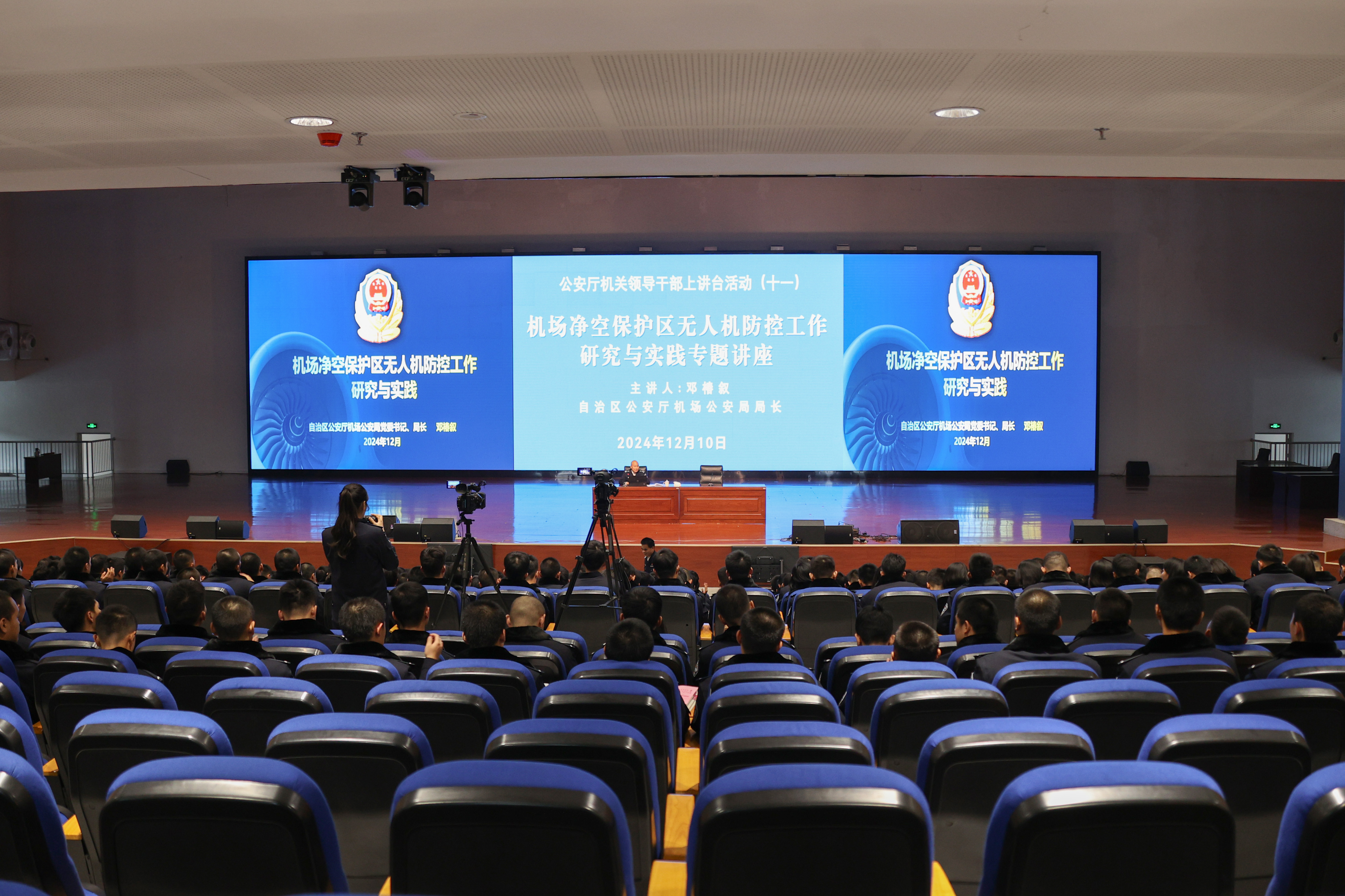 邓椿叙以《机场净空保护区无人机防控工作研究与实践》为题,从各种飞行器的原理、低空经济的巨大潜力和价值、低空经济发展给公安机关带来的影响和挑战、机场净空保护区无人机防控工作的重要性等方面,讲授了机场净空保护区的重要意义、对机场净空保护区无人机防控工作的思考,阐述了广西公安机关守正创新,组织无人机专项培训,开展无人机侦测试验,以“专业+机制+大数据”为方向,扎实做好各项防控工作,守护机场净空安全的生动实践。