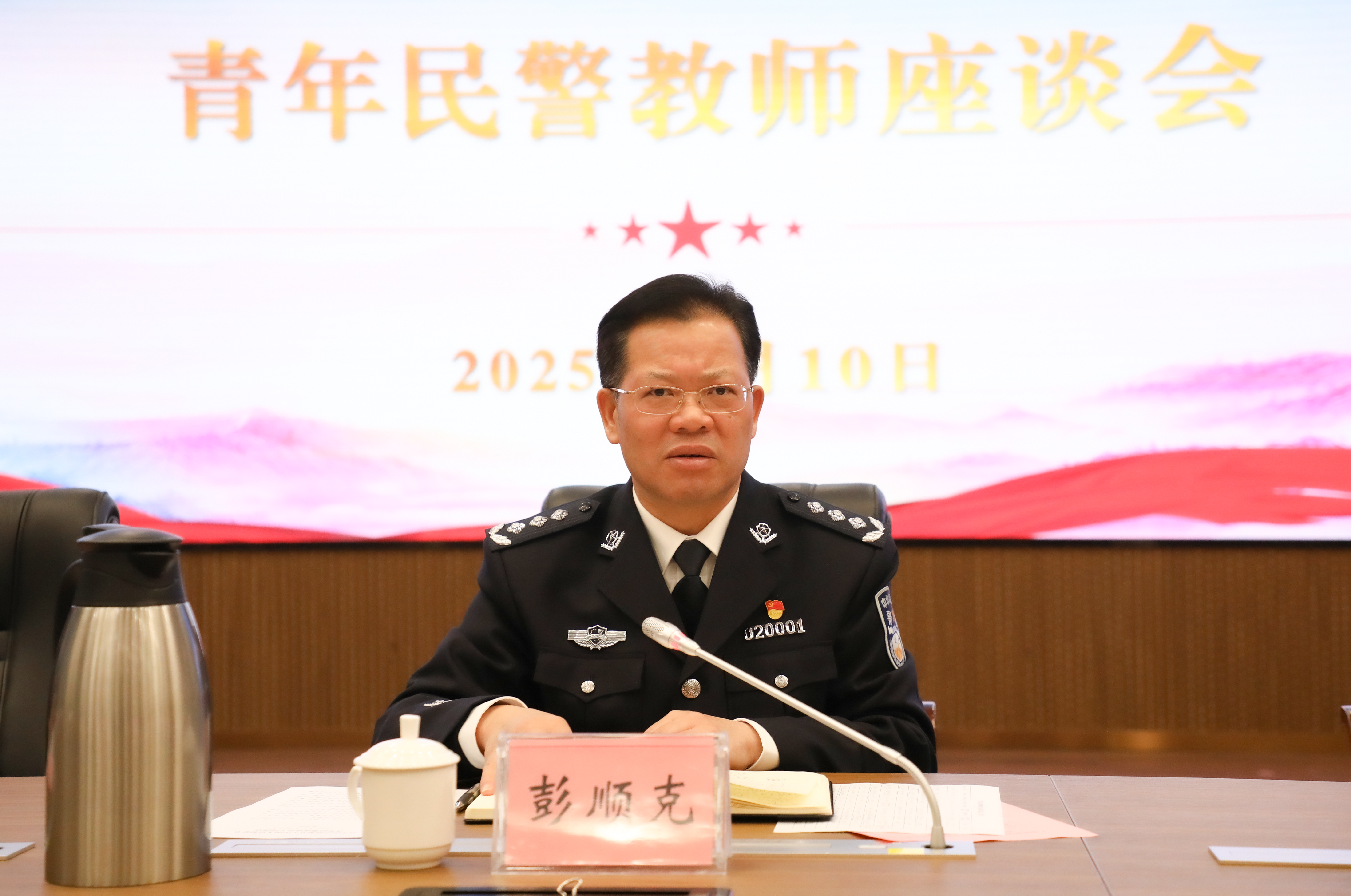 彭顺克认真倾听了教师代表的发言,认为教师们的发言政治站位高、切入实、认知深、表达畅、建议中肯,与会的青年民警们在各自的岗位上兢兢业业、勤奋工作,用实际行动践行了“对党忠诚、服务人民、执法公正、纪律严明”的总要求。彭顺克代表学校党委,向青年民警们致以诚挚的节日问候。