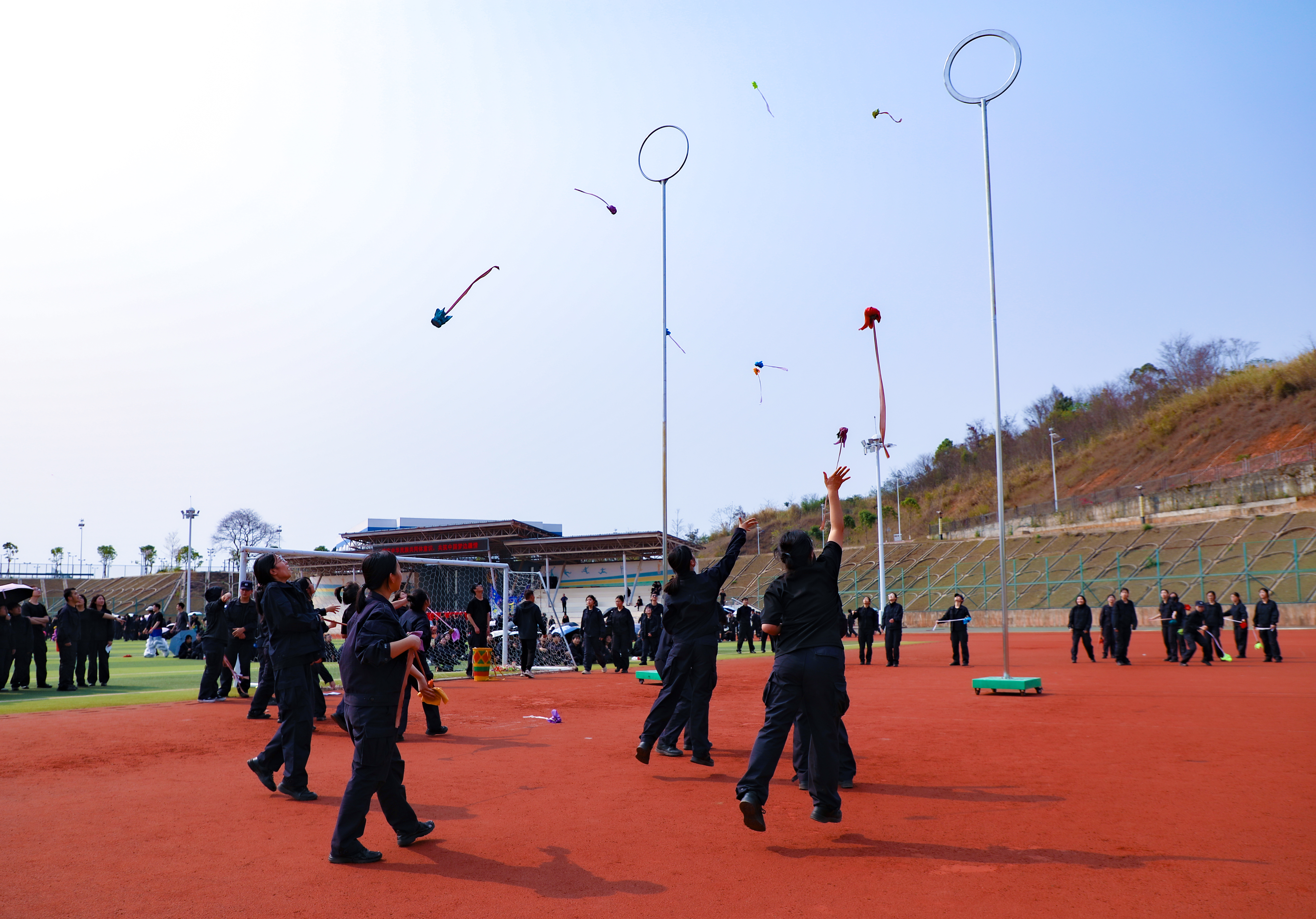 本次展示活动设置高杆绣球、背篓绣球、竹竿舞、踩高跷、毽球、三人板鞋等6个民族传统体育项目经典代表。这些项目不仅是强身健体的运动方式,更凝聚着民族发展历程中丰富的人文内涵和深厚的生命情感。背篓绣球项目中,同学们专注的眼神、精准的投掷,投出了对美好生活的向往;高杆绣球时,同学们一次次向高杆顶端圆筐发起冲击,展现出挑战自我的勇气;踩高跷的同学,努力保持平衡,稳健前行,克服了重重困难;三人板鞋竞速,同学们步伐一致、齐心协力,将团结协作的精神展现得淋漓尽致……活动中,同学们积极参与、互帮互助,尽情感受民族传统体育的乐趣,共同领略体育文化的独特魅力。