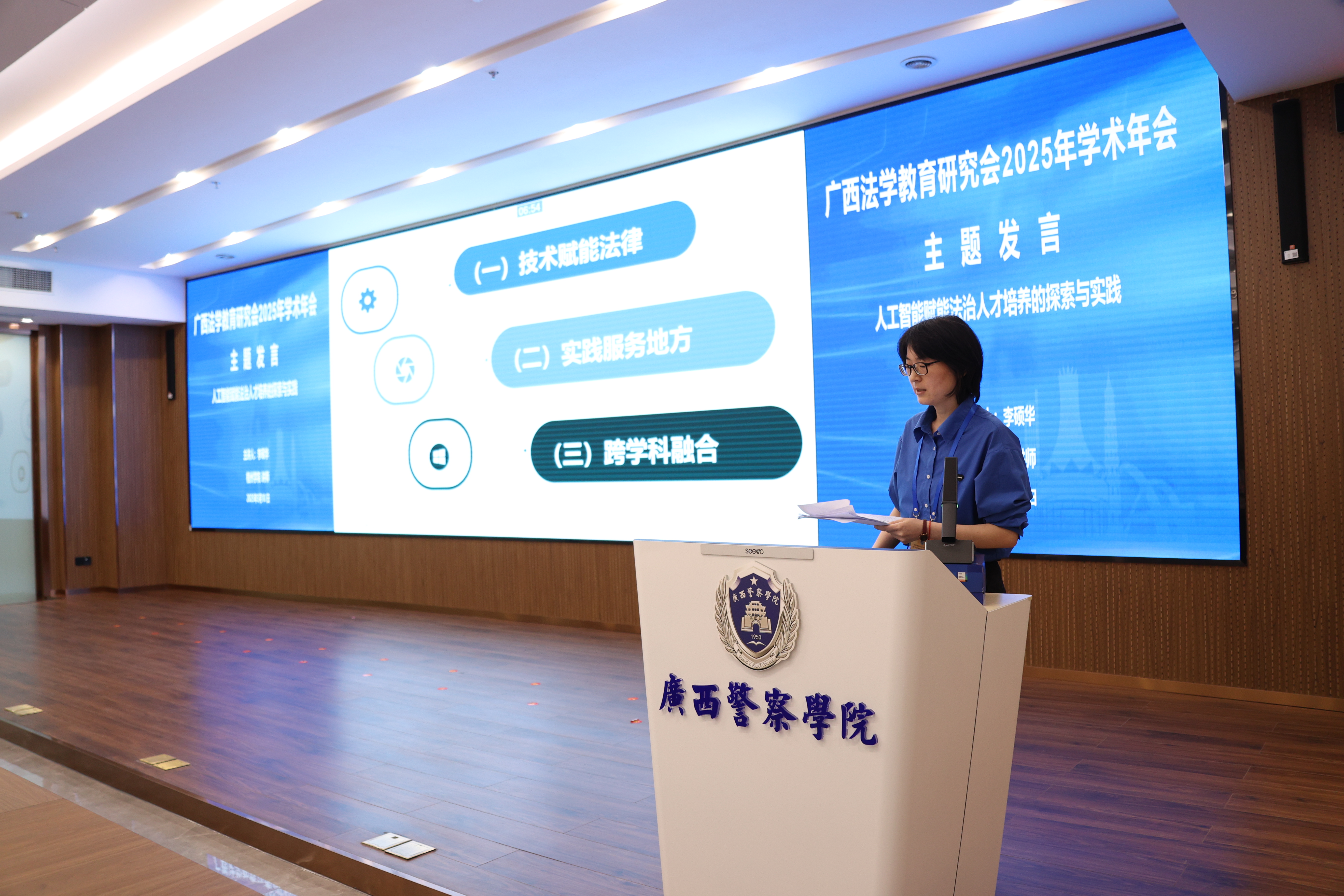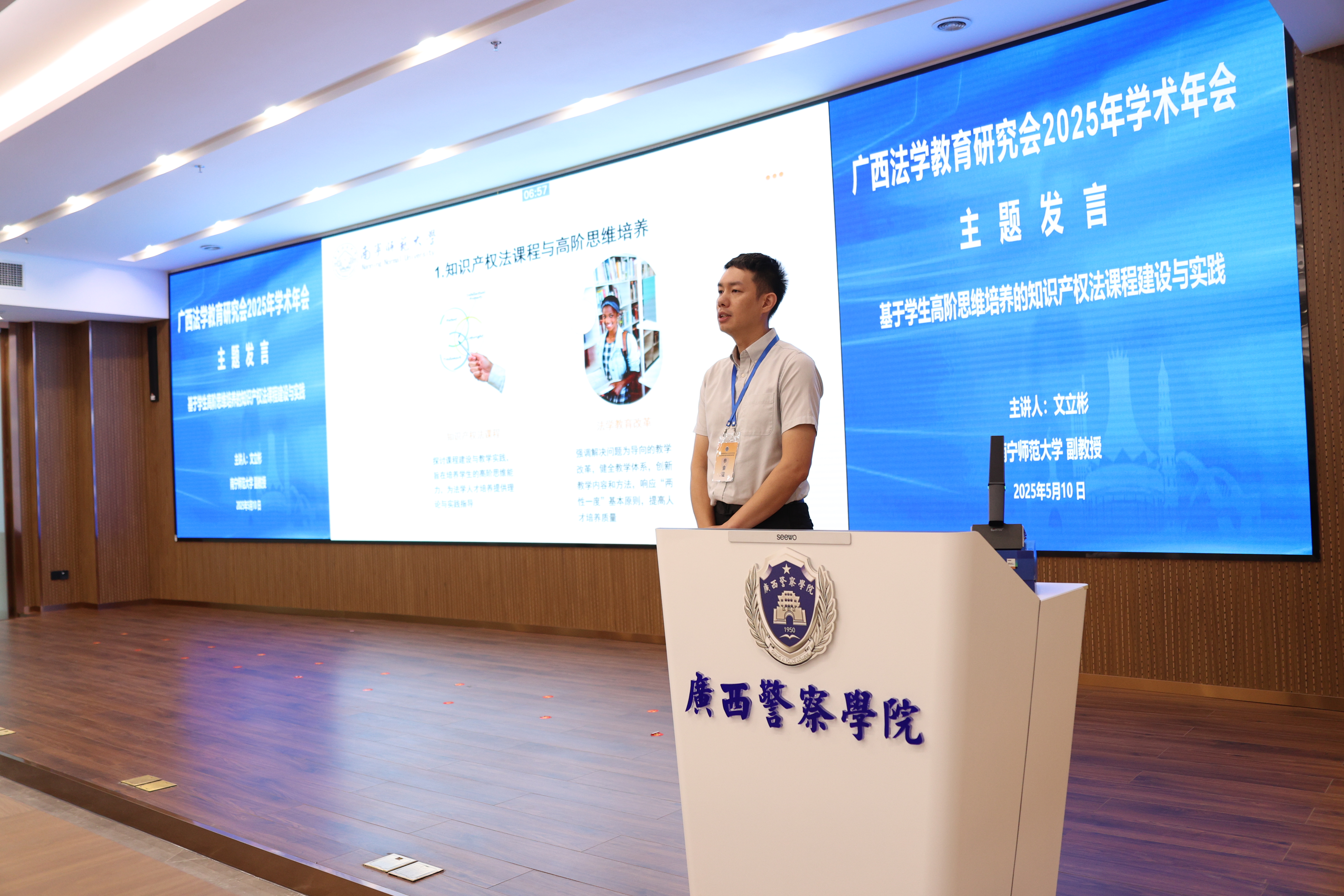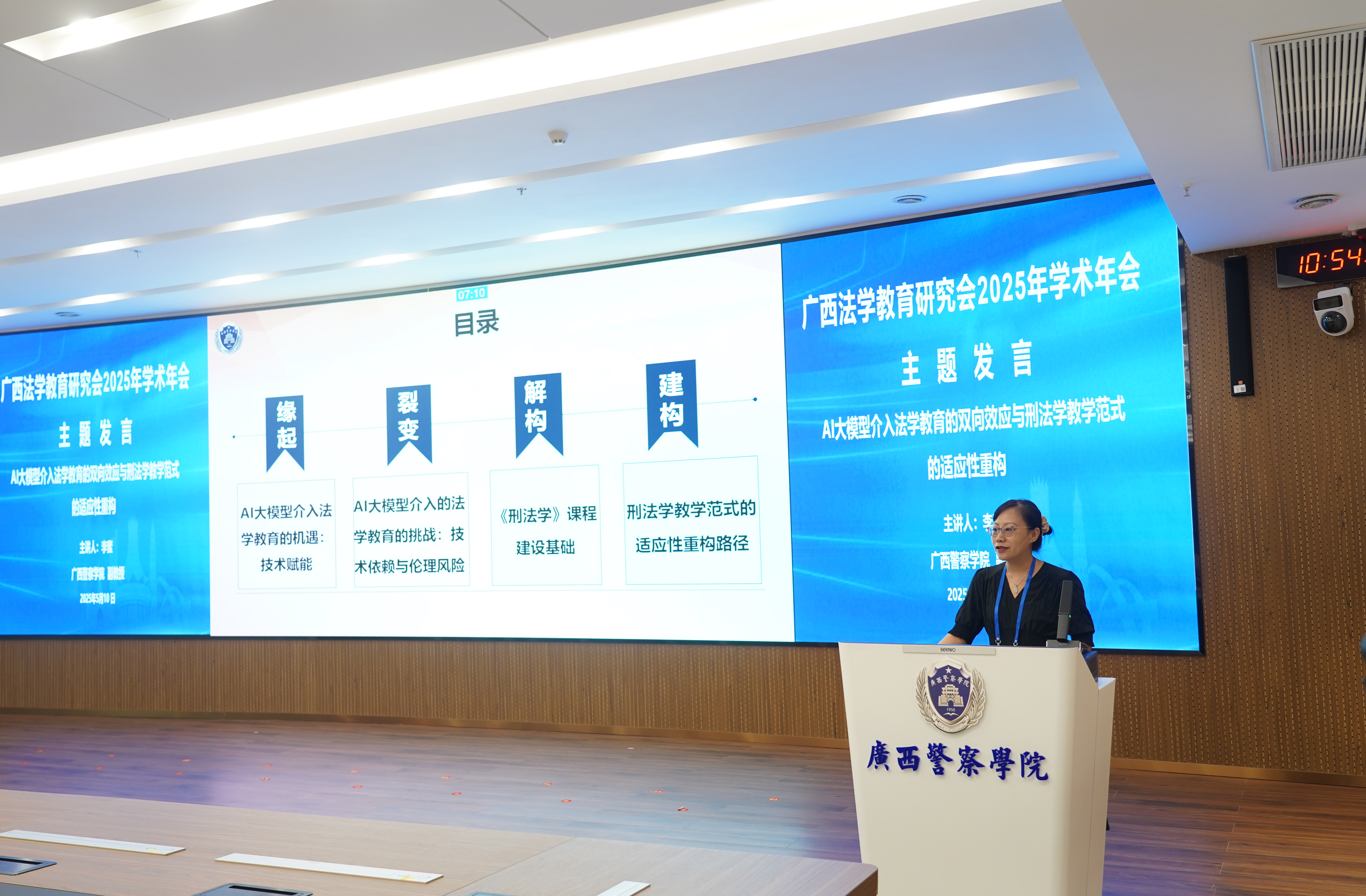 在主题发言环节,桂林电子科技大学法学院副院长赛铮、广西民族大学相思湖学院副教授梁旋、南宁师范大学法学与社会学院副教授文立彬、梧州学院法学院教师李硕华、桂林学院金融与法律学院副教授张晓敏、TapTap点点法学院副教授李蜜、广西师范大学法学院教授李志锴、广西民族大学法学院副教授杨海涛、广西财经学院法学院院长助理莫婷婷分别作主旨发言,分享了人工智能赋能法学教育、应用性法学人才培养等方面的创新实践,提出了人工智能时代对法学教育教学、人才培养、数字化教学模式的思考。