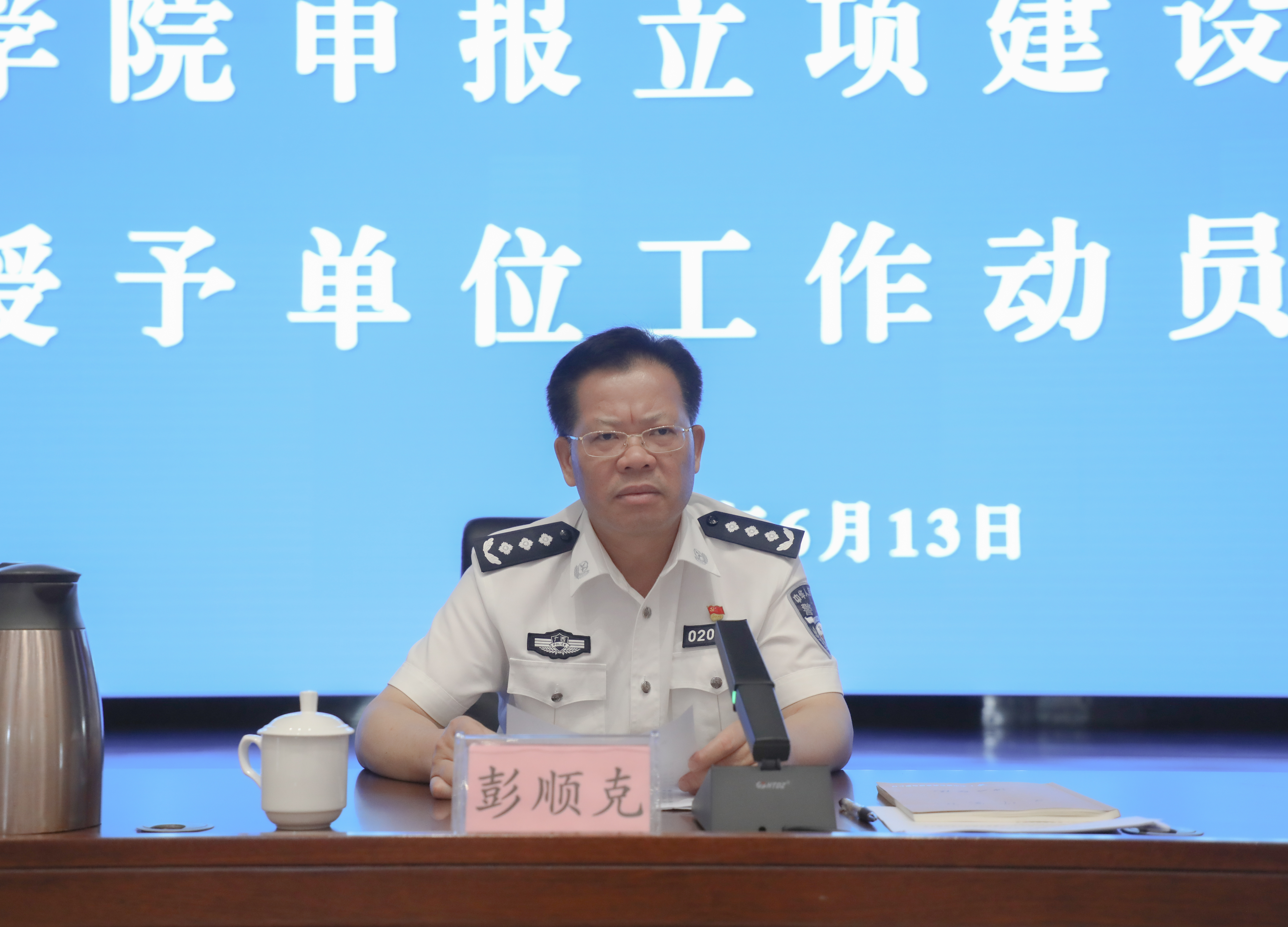 彭顺克强调,全校上下要以习近平新时代中国特色社会主义思想为指导,在自治区党委政府和自治区党委教育工委、公安厅党委坚强领导下,抢抓机遇、精准发力,蹄疾步稳、乘势而上,奋力推动学校办学层次迈上新台阶,为谱写中国式现代化广西篇章作出警院贡献。