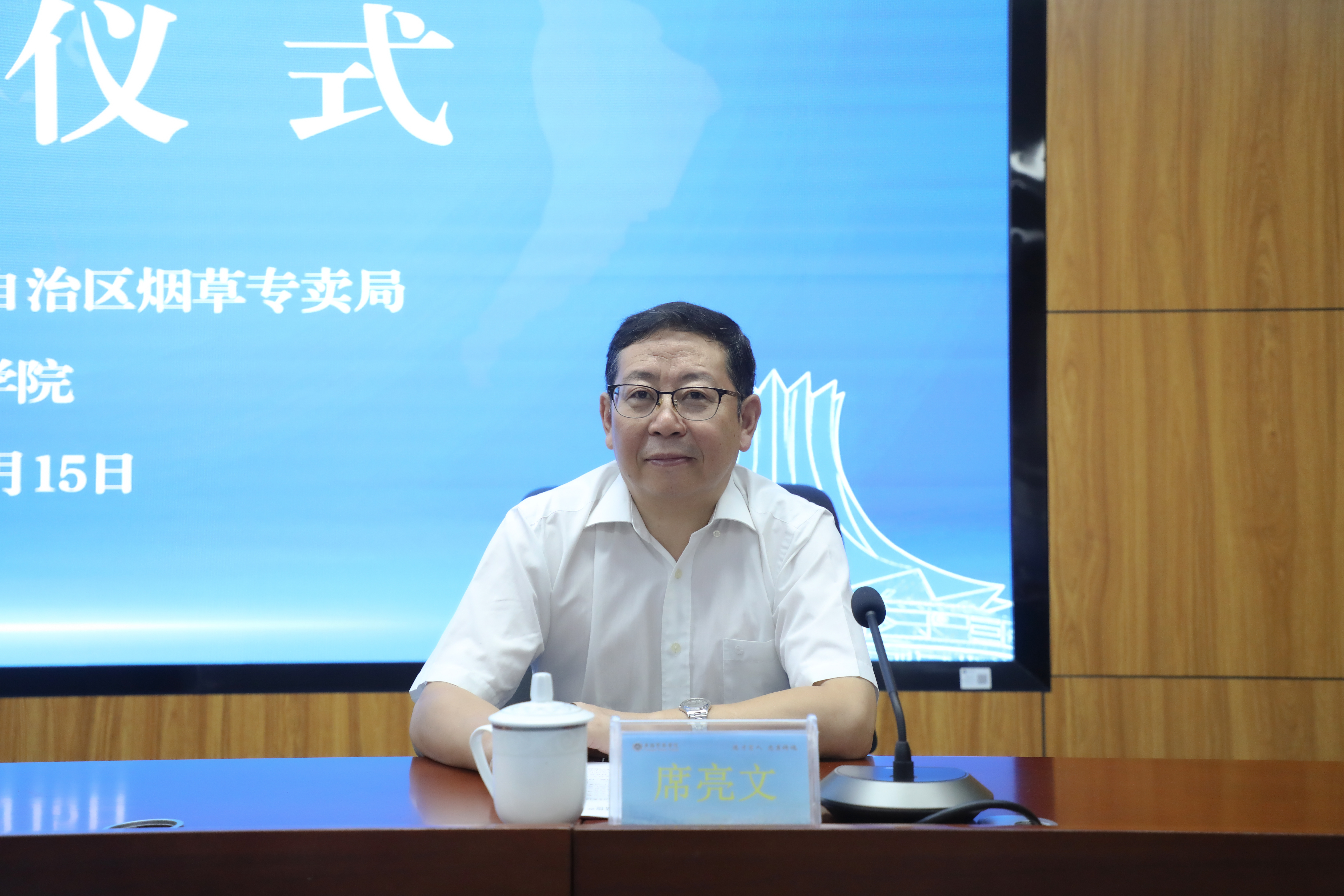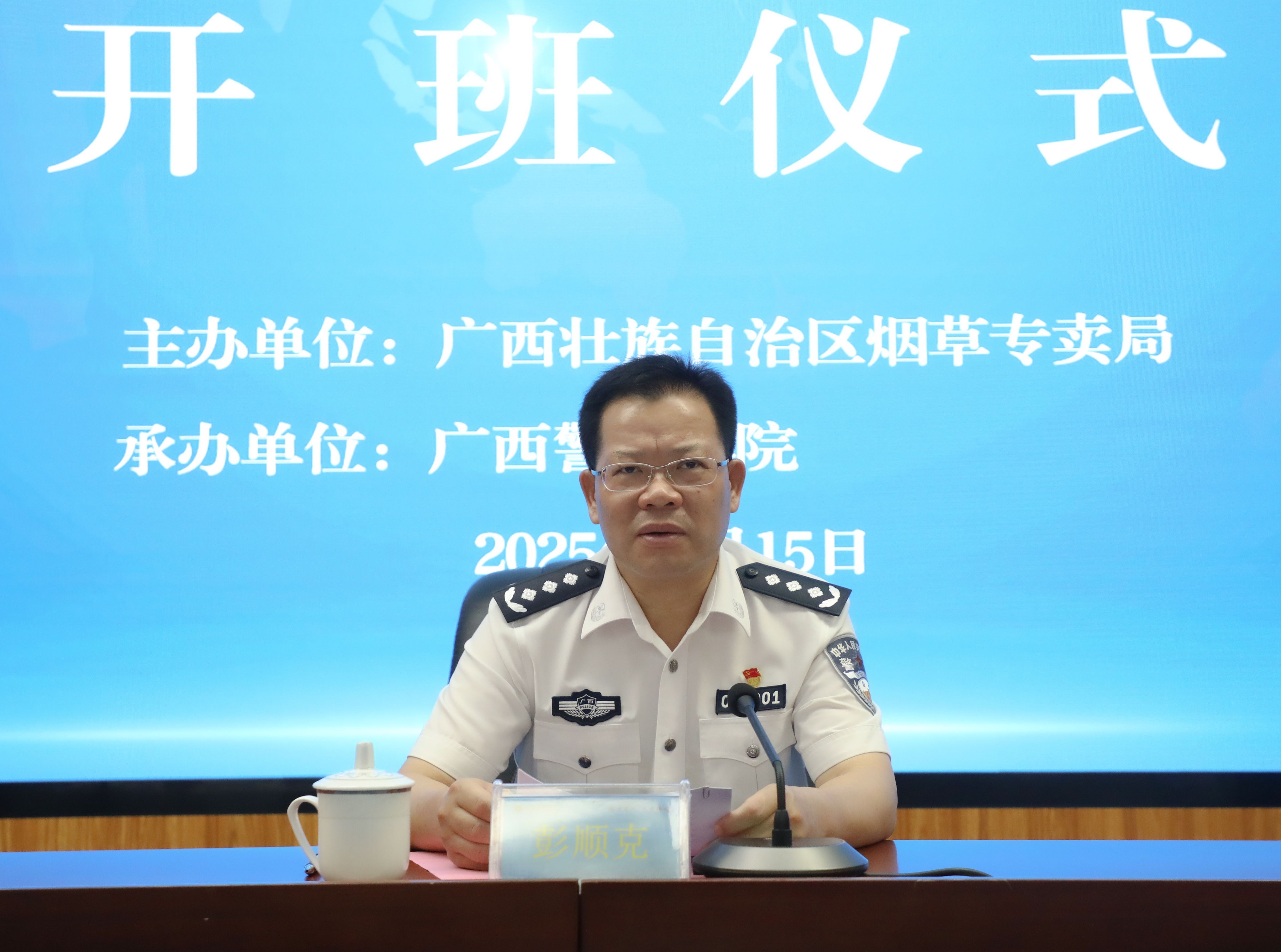 9月15日,广西区烟草专卖局案件侦查专项培训班在长湖校区开班。学校党委书记彭顺克,广西区烟草专卖局党组成员、副局长席亮文出席开班仪式。开班仪式后,彭顺克与席亮文进行座谈,就烟草执法队伍干部培训合作进行深入交流,共同探讨深化合作路径。