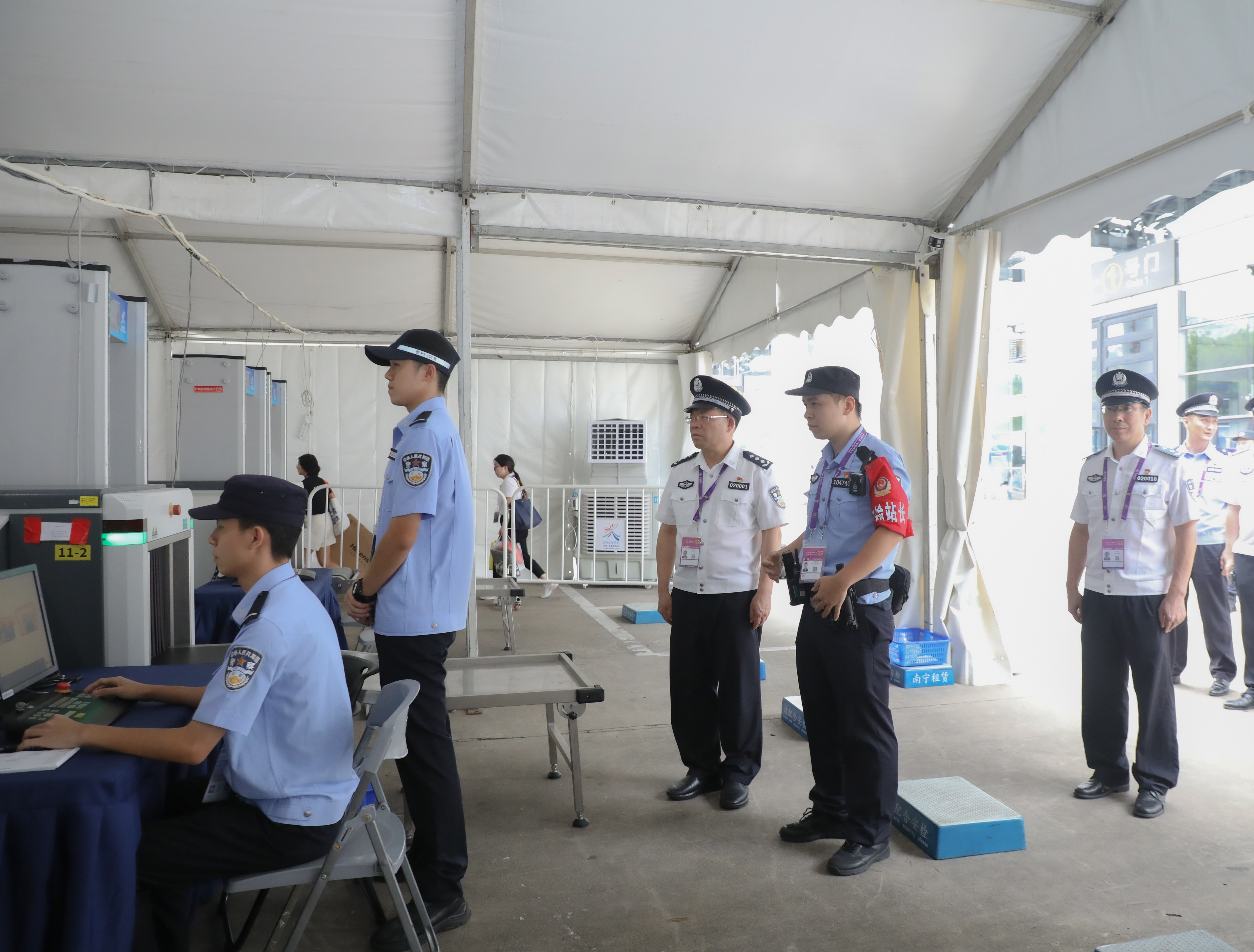 彭顺克、张军来到南宁国际会展中心的执勤点,实地检查指导师生执勤工作,详细了解了安检、人员部署和后勤保障等工作情况,向带队民警表示感谢,并与执勤师生进行交流。