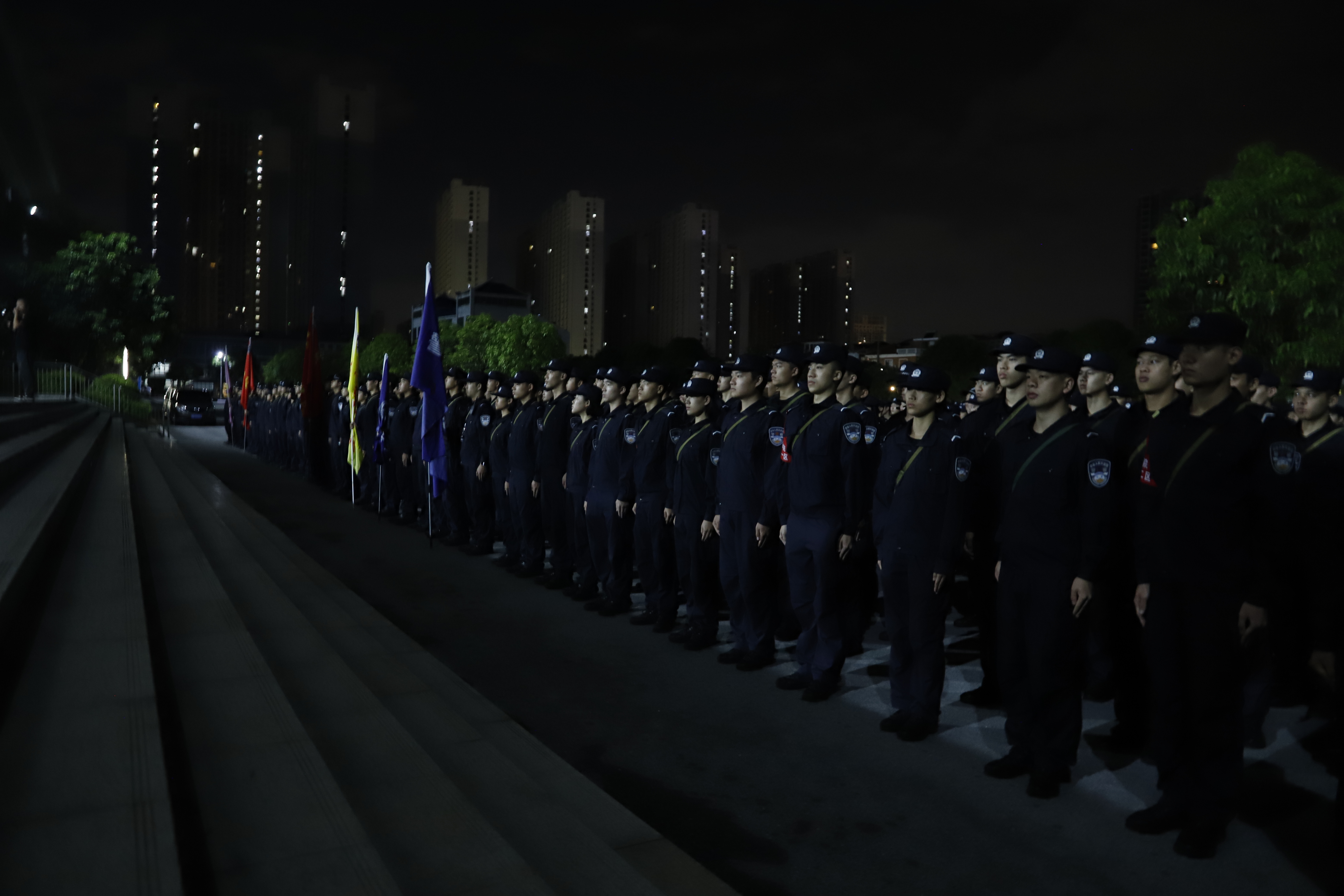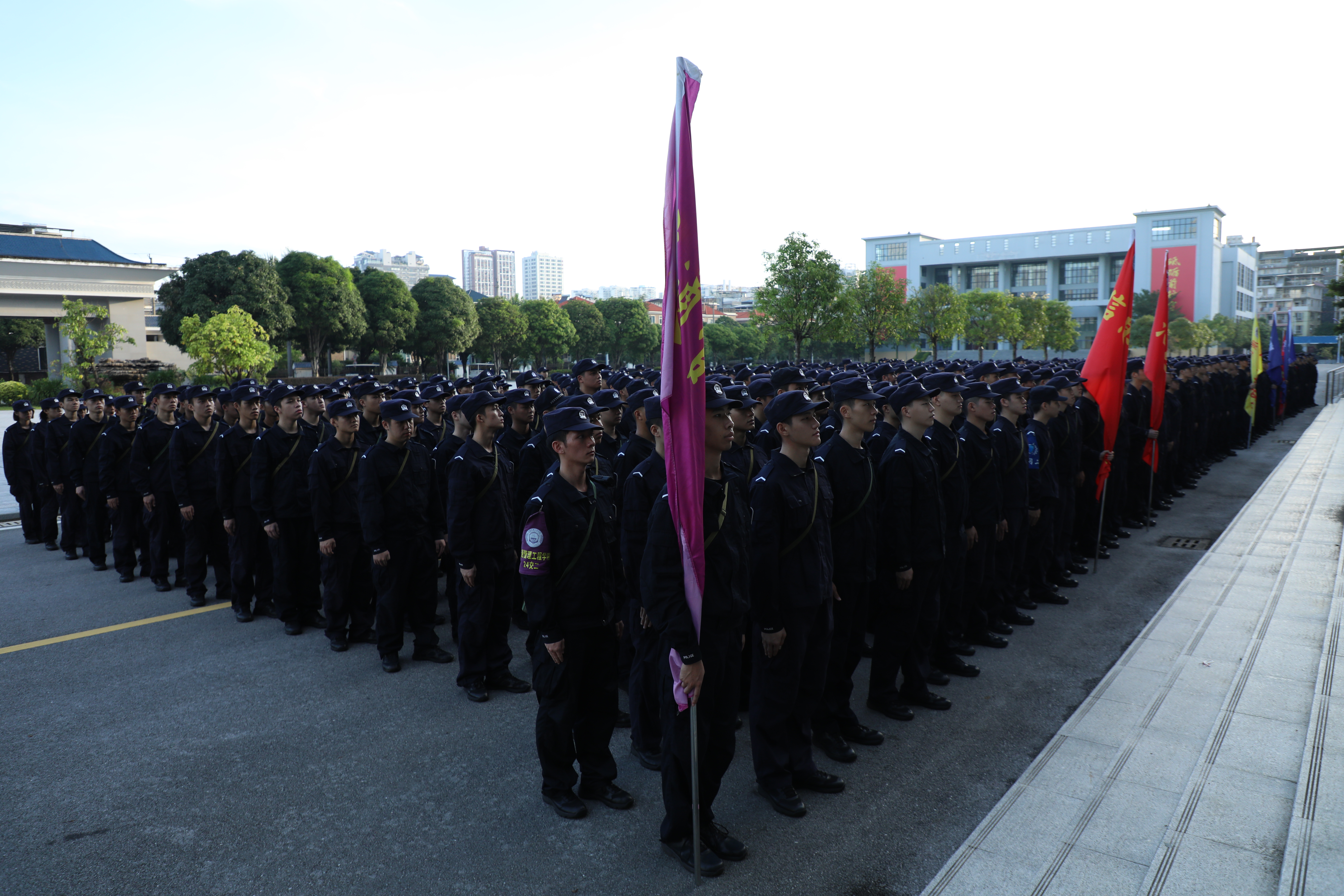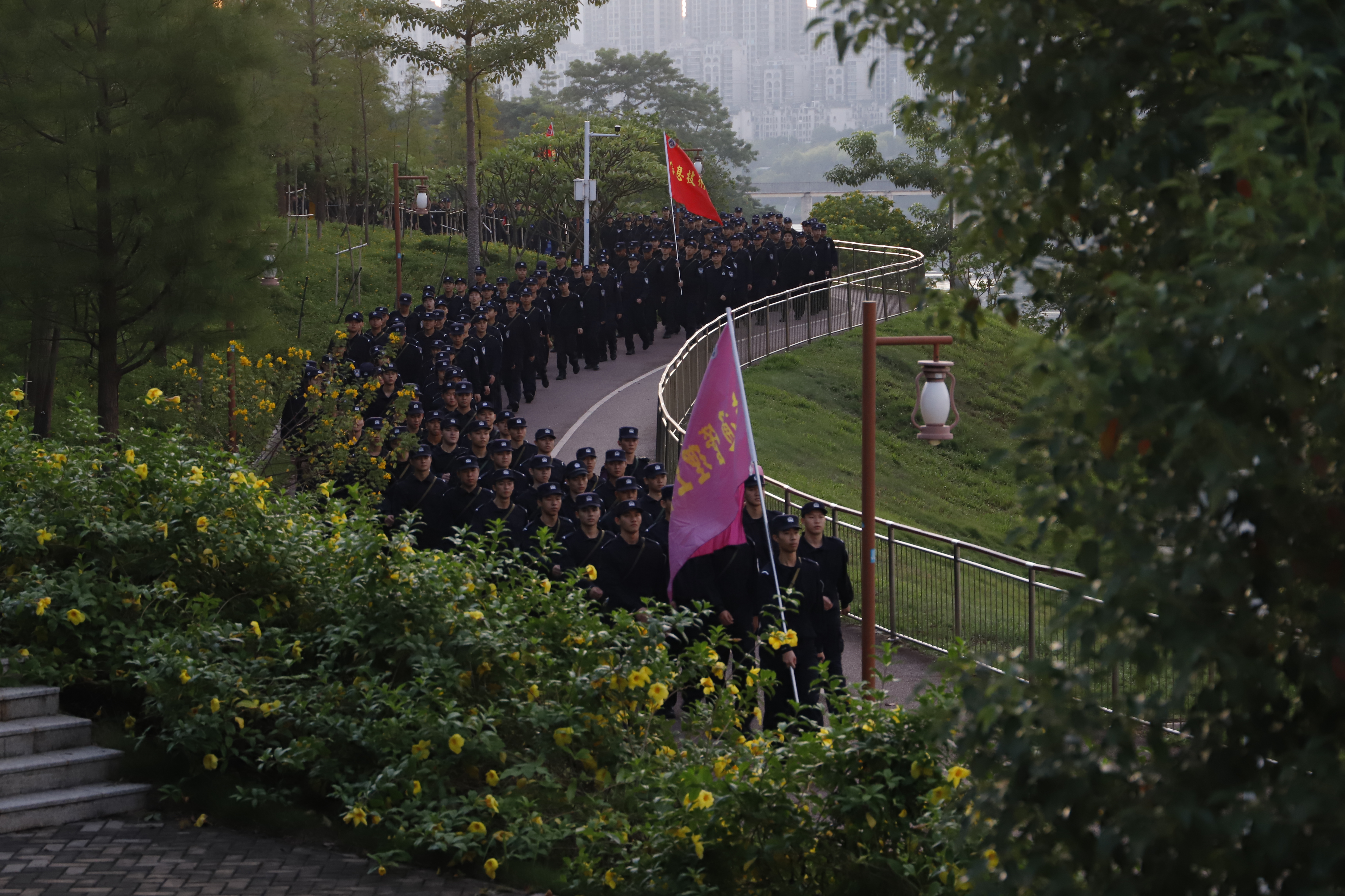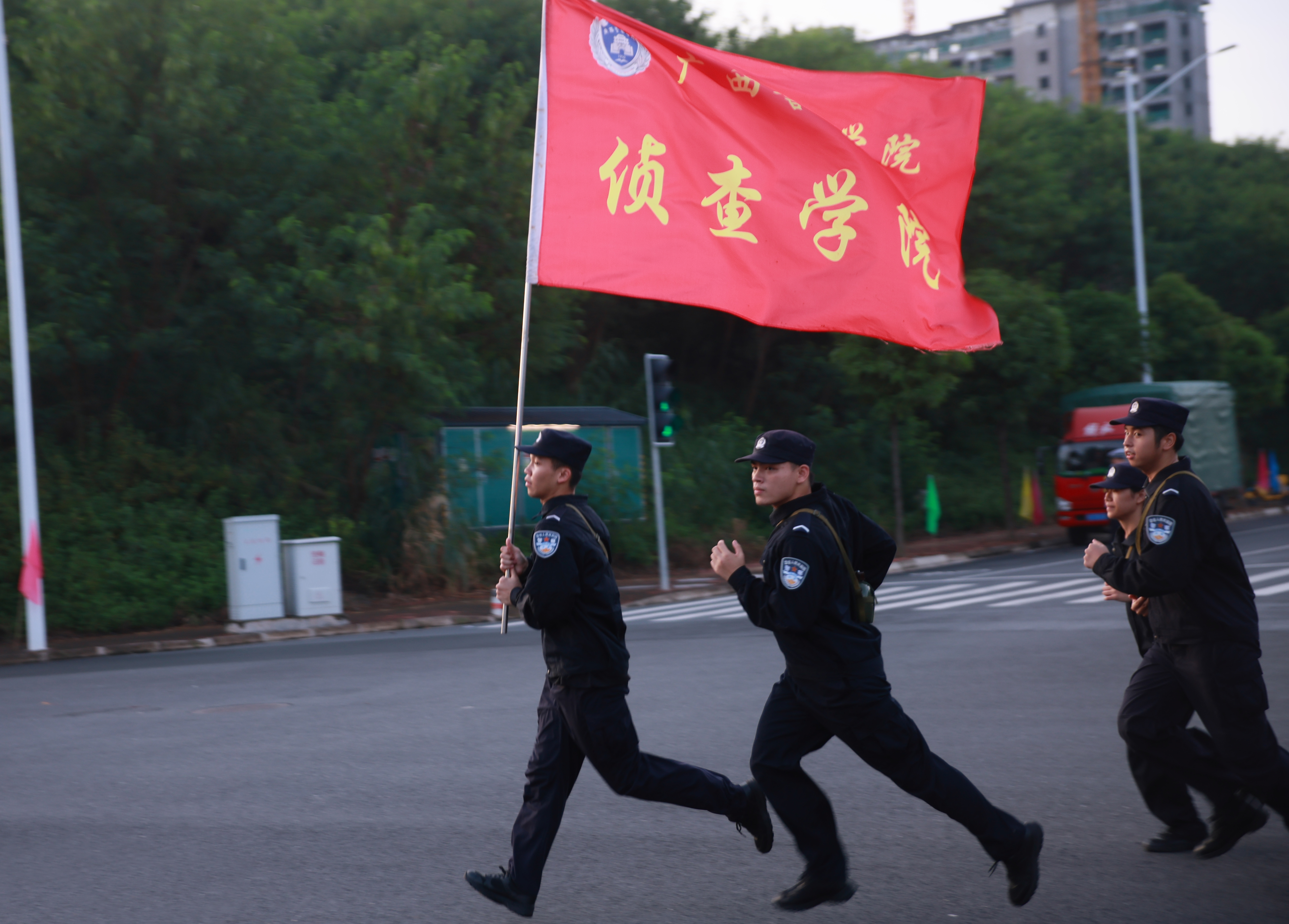 拉练途中,同学们精神饱满,阔步向前,各学院旗手们昂首挺胸,稳稳擎住旗帜,一面面院旗在夜色里格外醒目,成为队伍中最亮眼的“领航标”。面对10 公里的征途挑战,无人退缩、无人懈怠,大家相互鼓劲、并肩前行,排成紧密的纵队,彼此间保持着整齐的间距,整个队伍的行进整齐矫健。从黑夜到黎明,从市区道路到江岸,队伍始终保持着昂扬的姿态,每一步都充满力量,每一声呐喊都饱含信念,生动展现出警院学子不畏艰难、勇毅前行的精神风貌。各学院学管干部、辅导员引导保障,指挥车、后勤保障车、救护车全程随行,校属相关部门协同合作,学校与公安交管部门配合共同保障,拉练活动安全有序。