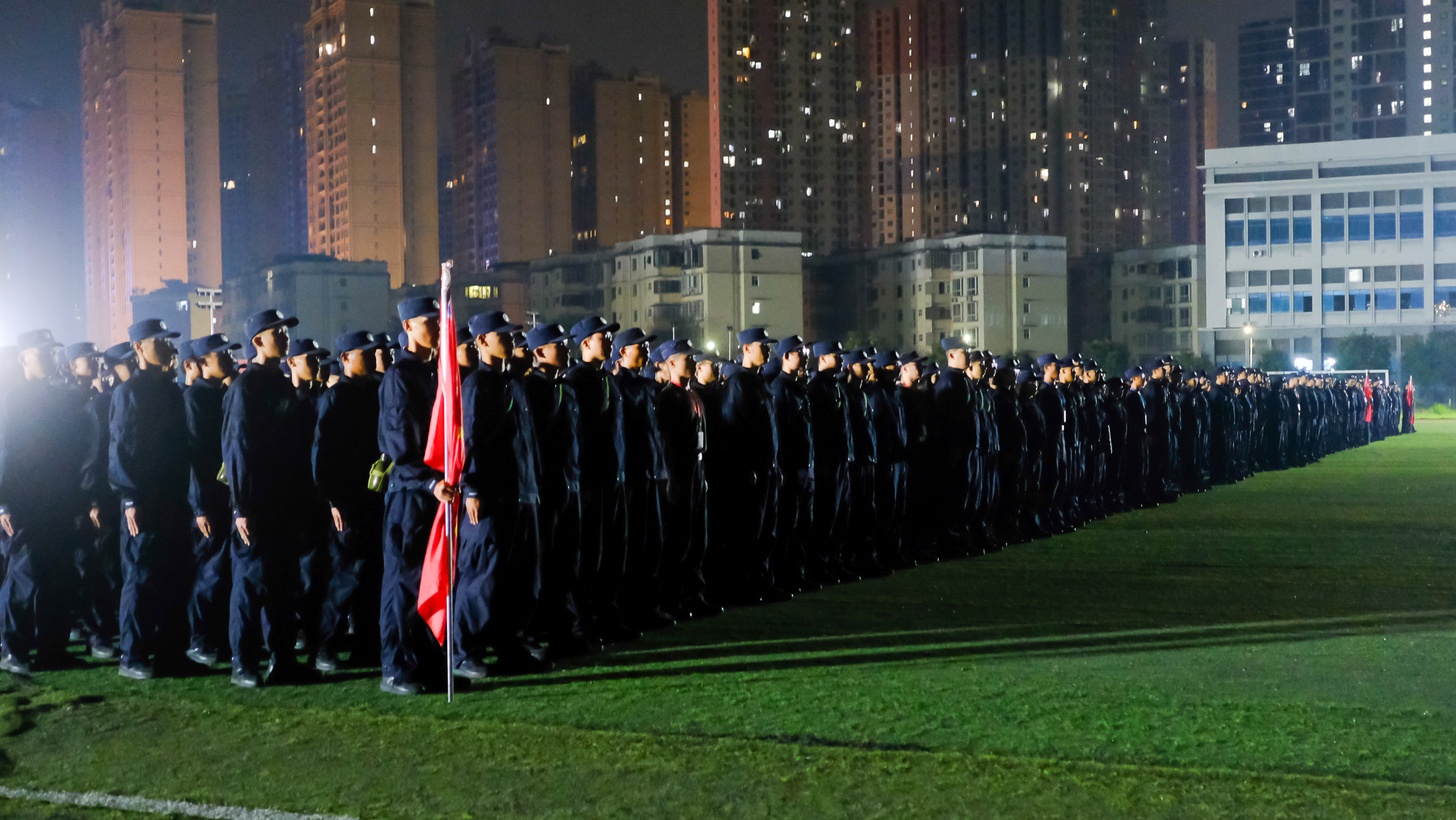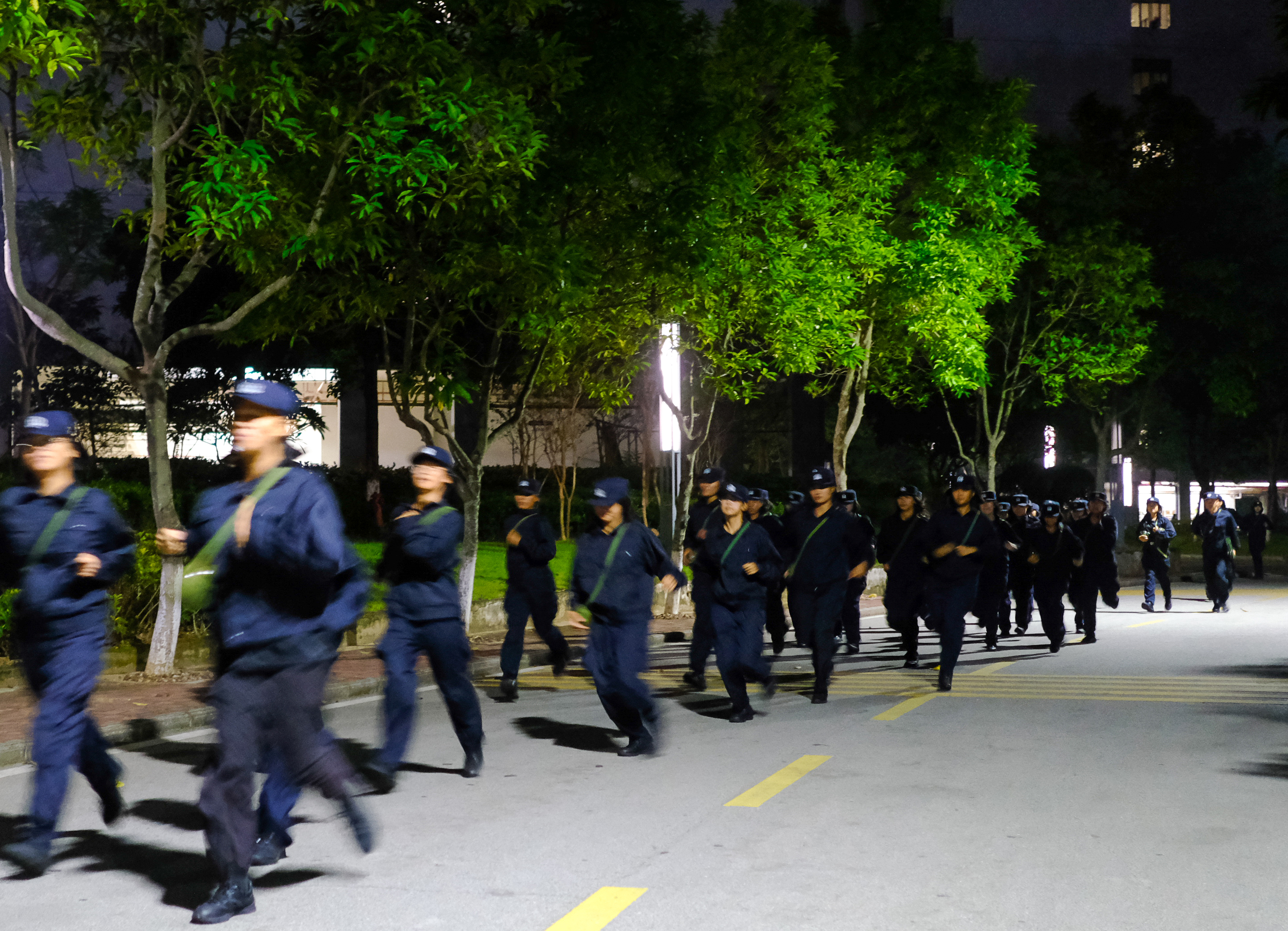 凌晨时分,紧急集合哨在校园吹响,新生们迅速行动,按规定穿戴衣物、携带应急装备,以区队为单位到宿舍周边指定地点集结,整个过程安静、快速、有序,藏蓝身影穿梭间尽显纪律性。小教官们细致清点人数,逐一核对装备携带情况,并第一时间向辅导员报告,集结过程精准可控。