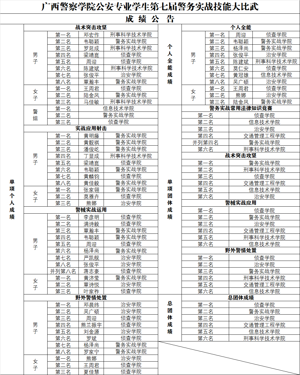 本届大比武紧密结合警务实战需求,设置了警务实战常用法律知识竞赛、实战应用射击、战术突击攻坚、警械实战应用、公安体能竞赛、野外警情处置6个项目。参赛的同学们训练有素、顽强拼搏,展现出昂扬奋发的精神风貌和精湛过硬的业务本领。经过激烈角逐,一批参赛集体和个人脱颖而出、荣获佳绩。校领导为获奖的集体和个人颁奖,见证他们以汗水铸本领、以拼搏促成长的光荣时刻。