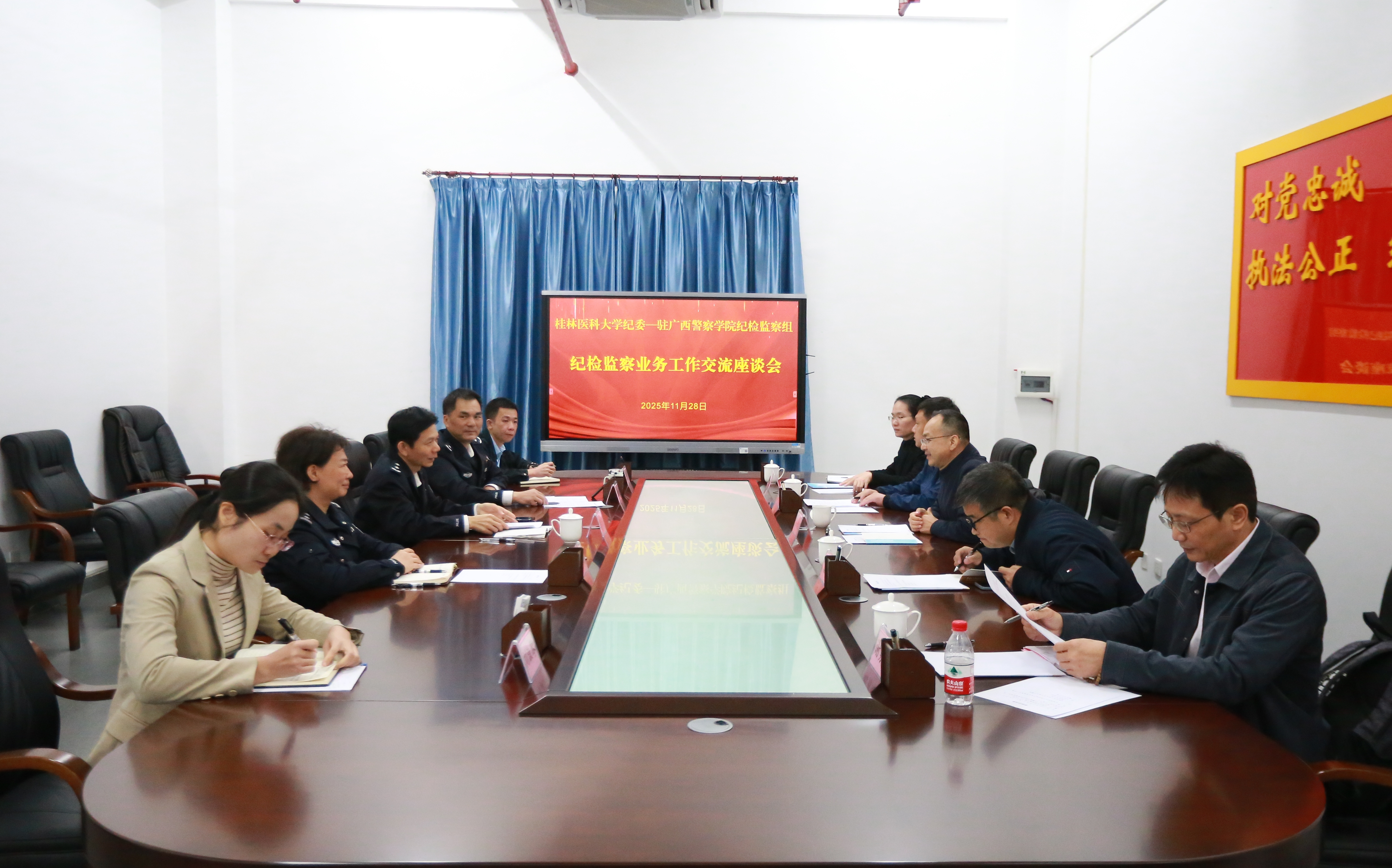 座谈会上,双方纪检干部围绕政治监督、廉政风险防控、监督体系构建、审查调查等纪检监察业务展开深入交流,就工作中遇到的共性问题、创新思路、交换意见,形成诸多共识。韦政权表示,警院廉洁教育进课堂的模式具有很强的借鉴性和实操性,为桂林医科大学进一步推进廉洁教育融入医学人才培养全过程提供了新思路。黎东表示,两校虽专业领域不同,但都在努力培育让党放心、让人民满意、忠诚干净担当的“人民卫士”,在清廉建设和廉洁育人方面有着共同的目标和任务,要以此次交流为契机,建立常态化沟通交流机制,互通有无、共享经验,携手推动清廉学校建设工作迈上新台阶。