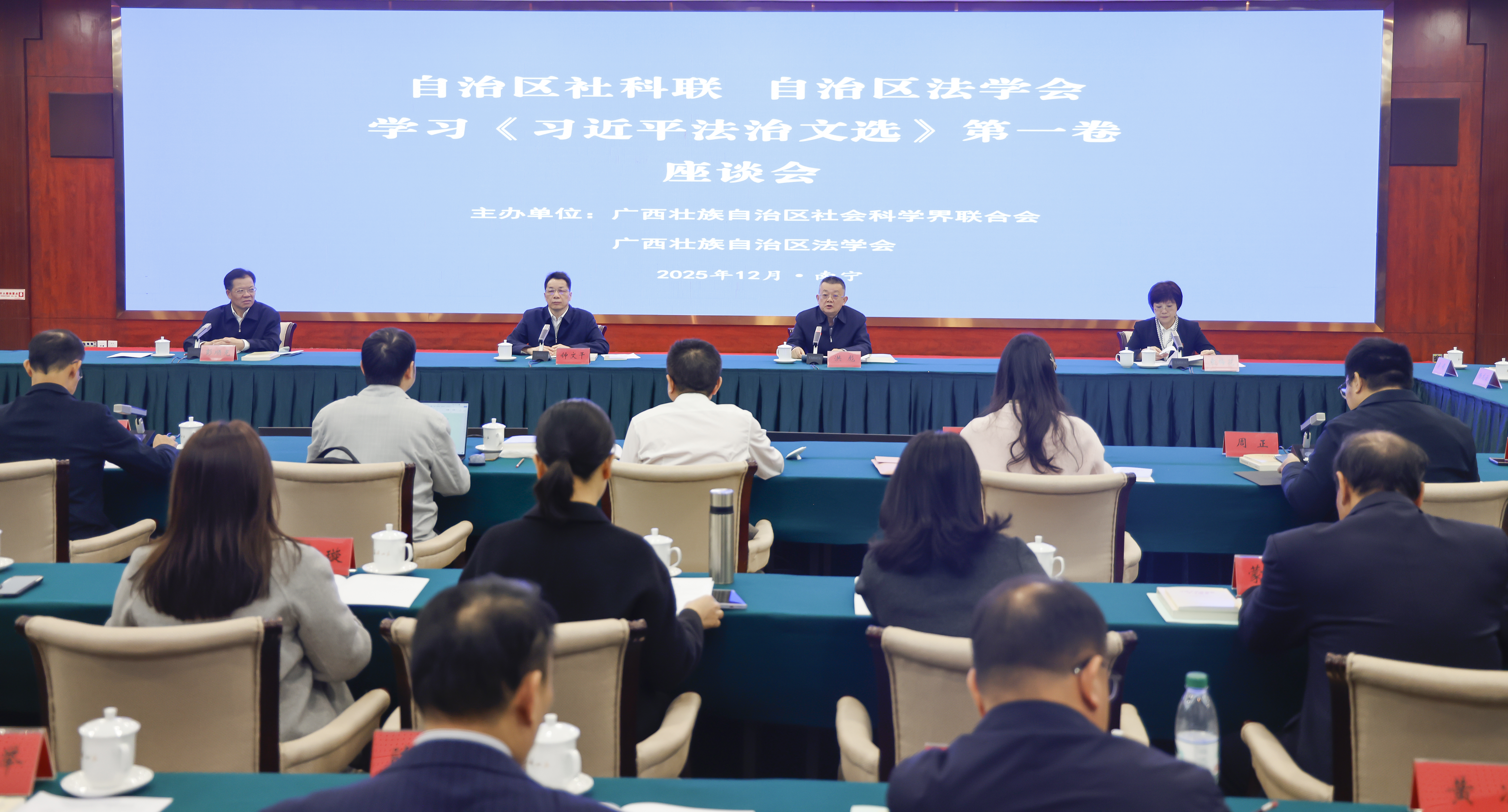 12月5日,由自治区社科联、自治区法学会联合主办的学习《习近平法治文选》第一卷座谈会在南宁召开。学校党委书记、自治区法学会副会长(兼)彭顺克受邀出席会议并作专家主旨发言。自治区法学会党组成员、专职副会长兼秘书长洪彪主持会议,自治区社科联党组成员、副主席、自治区法学会副会长(兼)钟文干作总结讲话。