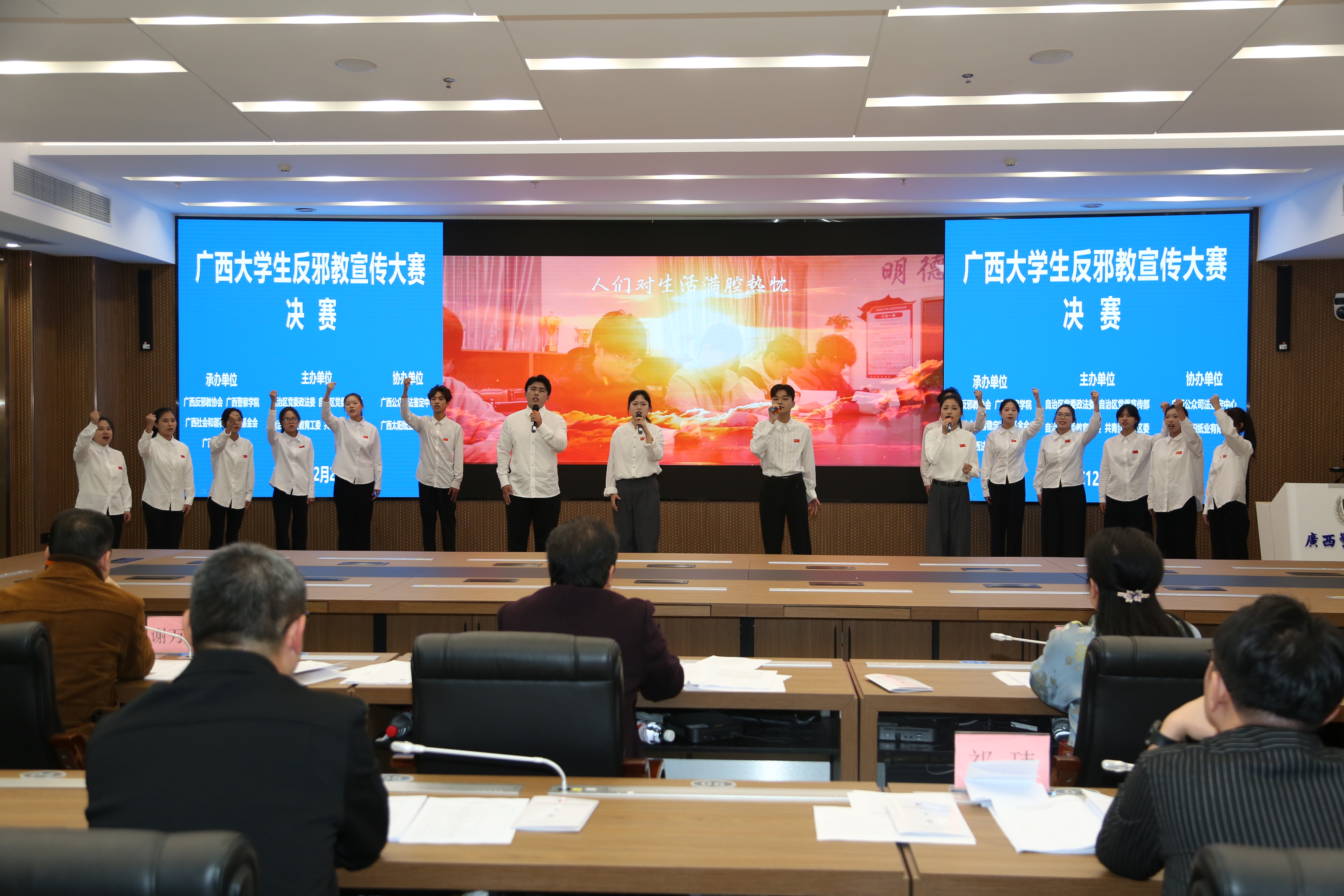 12月28日,广西大学生反邪教宣传大赛颁奖仪式在TapTap举行。自治区党委政法委副书记杨斌,自治区党委宣传部二级巡视员周三胜,自治区教育厅副厅长张元良,共青团广西区委副书记荣丽伟,广西反邪教协会理事长覃忠,广西社会和谐稳定发展基金会副理事长黄焕光,广西法治日报社副总编辑陆寿青,学校党委副书记、校长何立荣,副校长韦岗宁出席颁奖仪式。