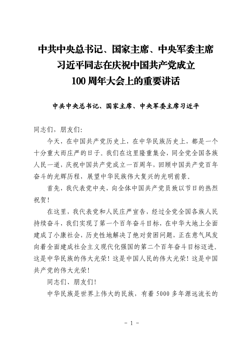 中共中央总书记、国家主席、中央军委主席习近平同志在庆祝中国共产党成立100周年大会上的重要讲话 来源: 发布时间:2021-07-01 18:35:53 浏览次数: 次 【字体:小 大】 分享到: 【打印正文】