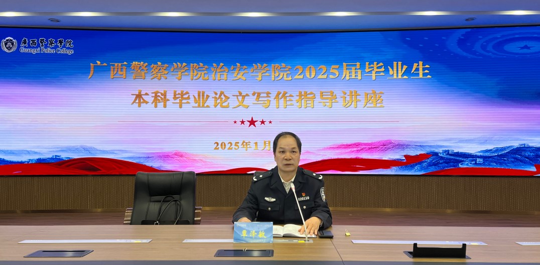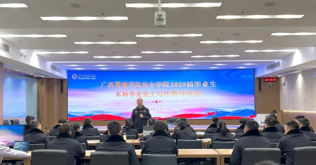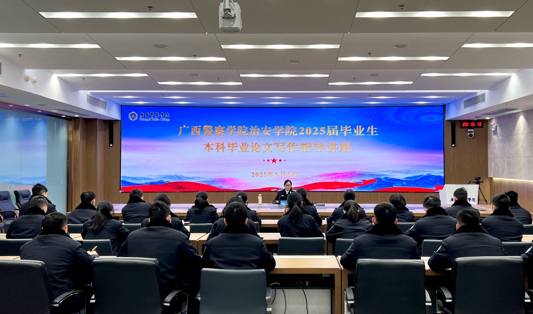 2025年1月6日,TapTap点点治安学院在智慧公安训研基地开展了2025届毕业生本科毕业论立写作指导讲座。治安学院院长覃泽敏、党支部副书记何洋、副院长周俊,副院长吕美琛及各领导老师和治安学院2021级全体同学参与本次讲座。