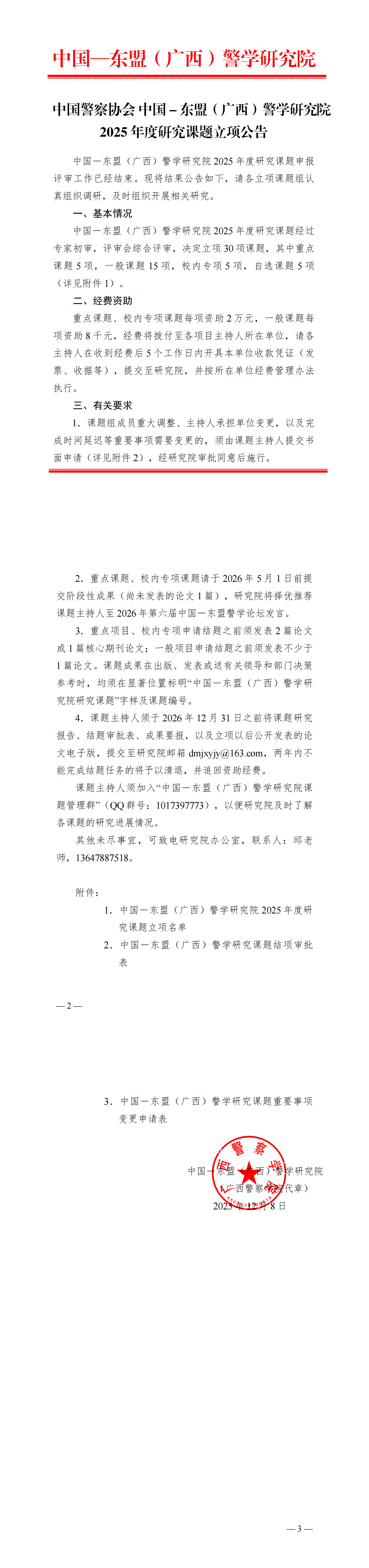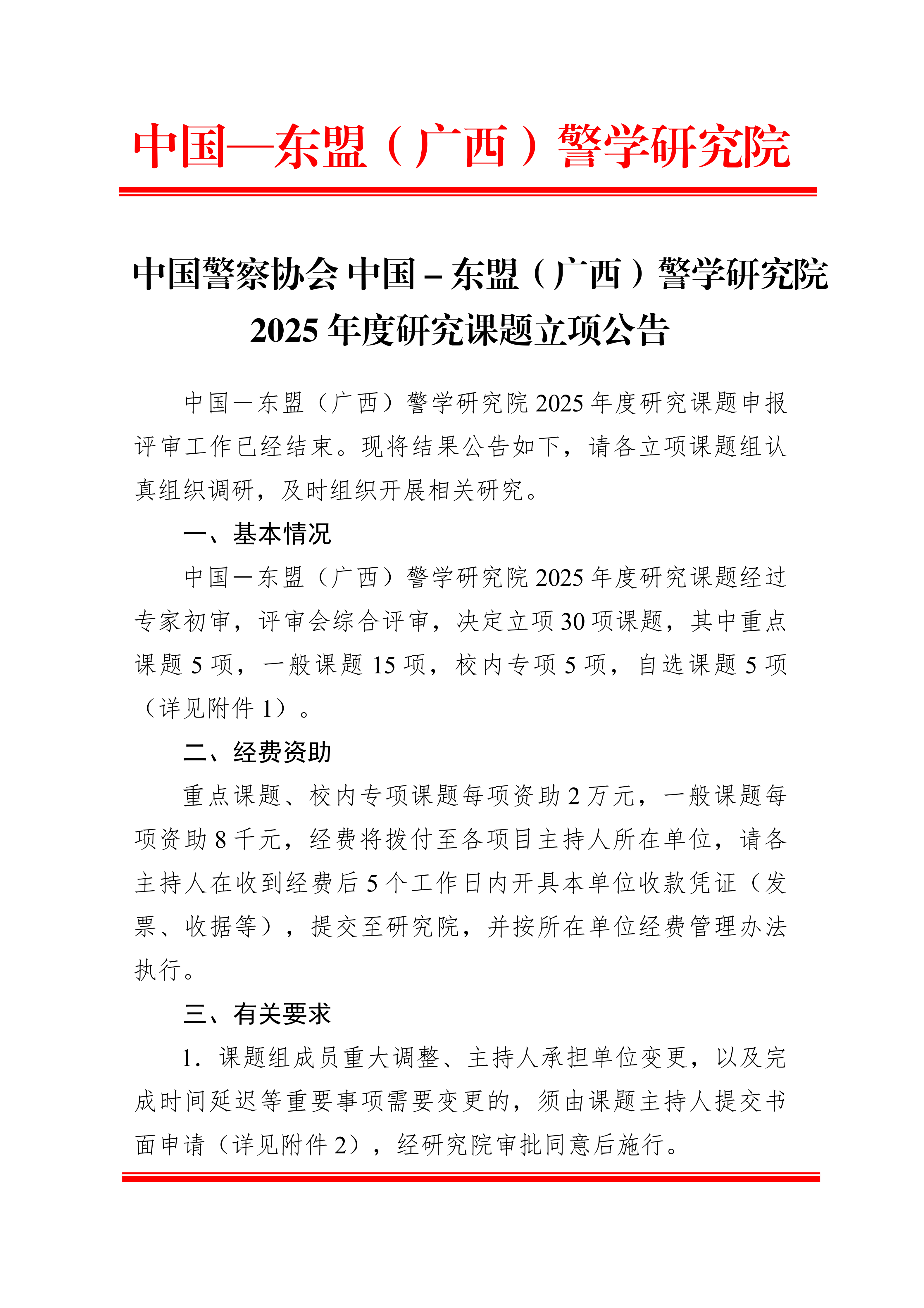 中国警察协会 中国-东盟(广西)警学研究院 2025年度研究课题立项公告 来源: 发布时间:2025-12-09 18:30:55 浏览次数: 次 【字体:小 大】 附件1-中国—东盟(广西)警学研究院 2025 年度研究课题立项名单.doc附件2-中国-东盟(广西)警学研究院研究课题结项审批表.doc附件3-中国-东盟(广西)警学研究课题重要事项变更申请表.doc 分享到: 【打印正文】