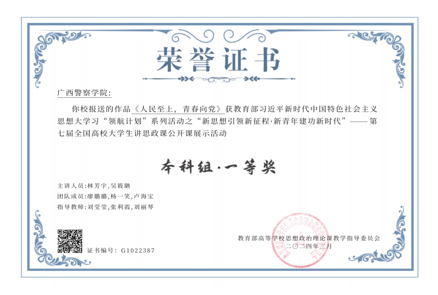 马克思主义学院直属党支部下设6个党小组,教研室主任兼任党小组组长,推动党建与教学科研同频共振。学院坚持以“忠诚”教育为核心,着力打造“学校主课堂+社会大课堂+数智新课堂”三维协同铸警魂的思政课教学模式,获自治区本科教改重点立项,成功入选全区高校思想政治工作改革创新经验推广项目。教学建设成果丰硕,4个教研室获评校级先进教研室,思政课教学创新团队获评校级优秀教学团队;开设“公安英模教育”“广西公安史”等公安特色课程,厚植学生爱国、敬业、奉献的职业情怀。近年来,党员教师荣获“公安部教学名师”“自治区模范教师”等荣誉称号25项;师生参赛获奖228项,其中国家级奖项1项,省部级69项;获评自治区本科一流课程3门,学院连续三年获得学校教学管理先进单位。