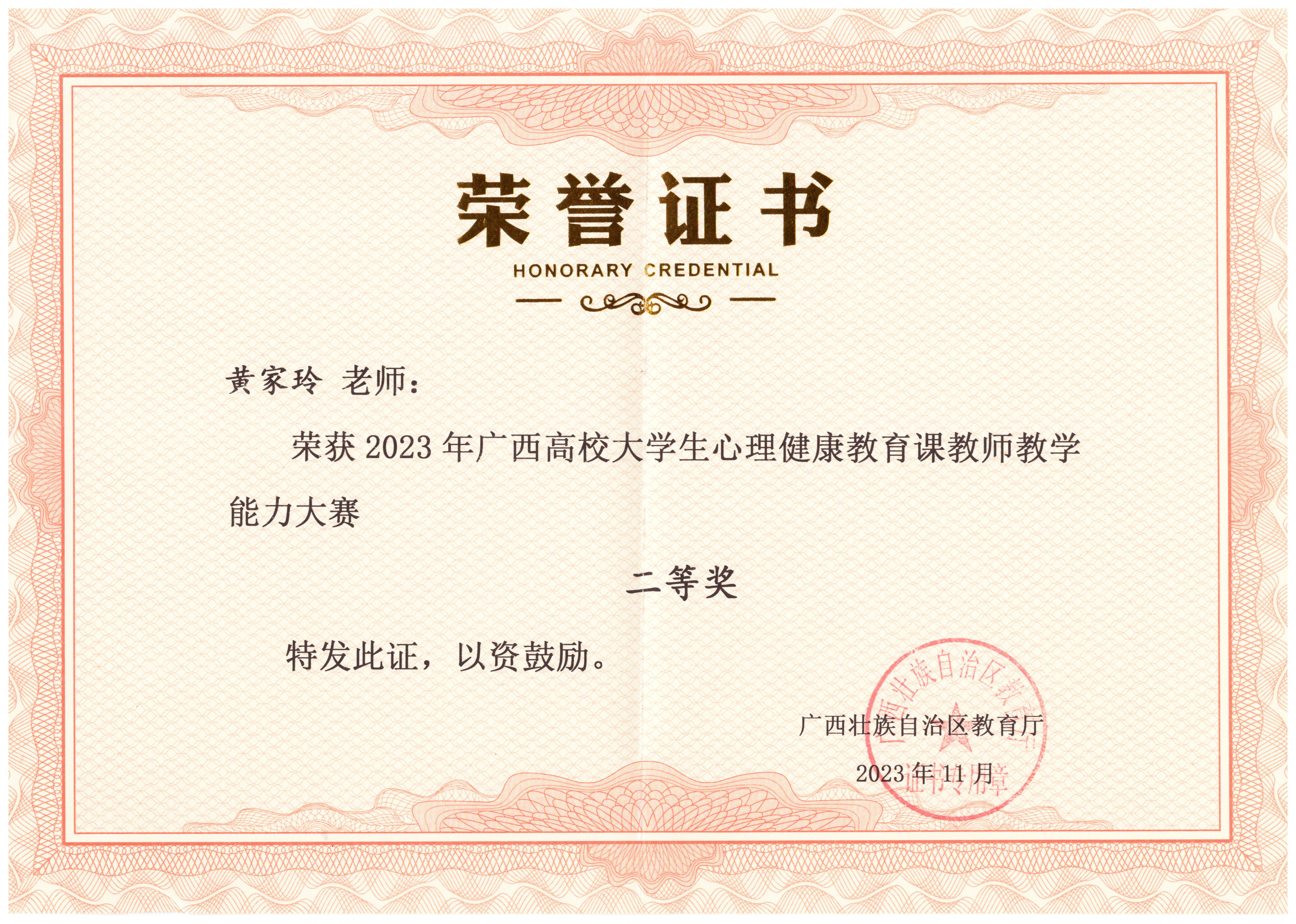 改革创新,教学成果多点突破。将人文素养教育与思政进课堂结合起来,通过打造“线上线下”混合式课程、推行“以学生为中心”的翻转课堂,不断探索教学新模式。多名教师在各级教学竞赛中斩获佳绩,多项教改课题顺利结题,教学成果奖实现新突破。黄家玲老师荣获2023年广西高校大学生心理健康教育课教学比赛二等奖。熊微老师2024年指导学生参加第二届全国大学生职业生涯规划大赛校级比赛,获就业赛道金奖、成长赛道金奖各1项。