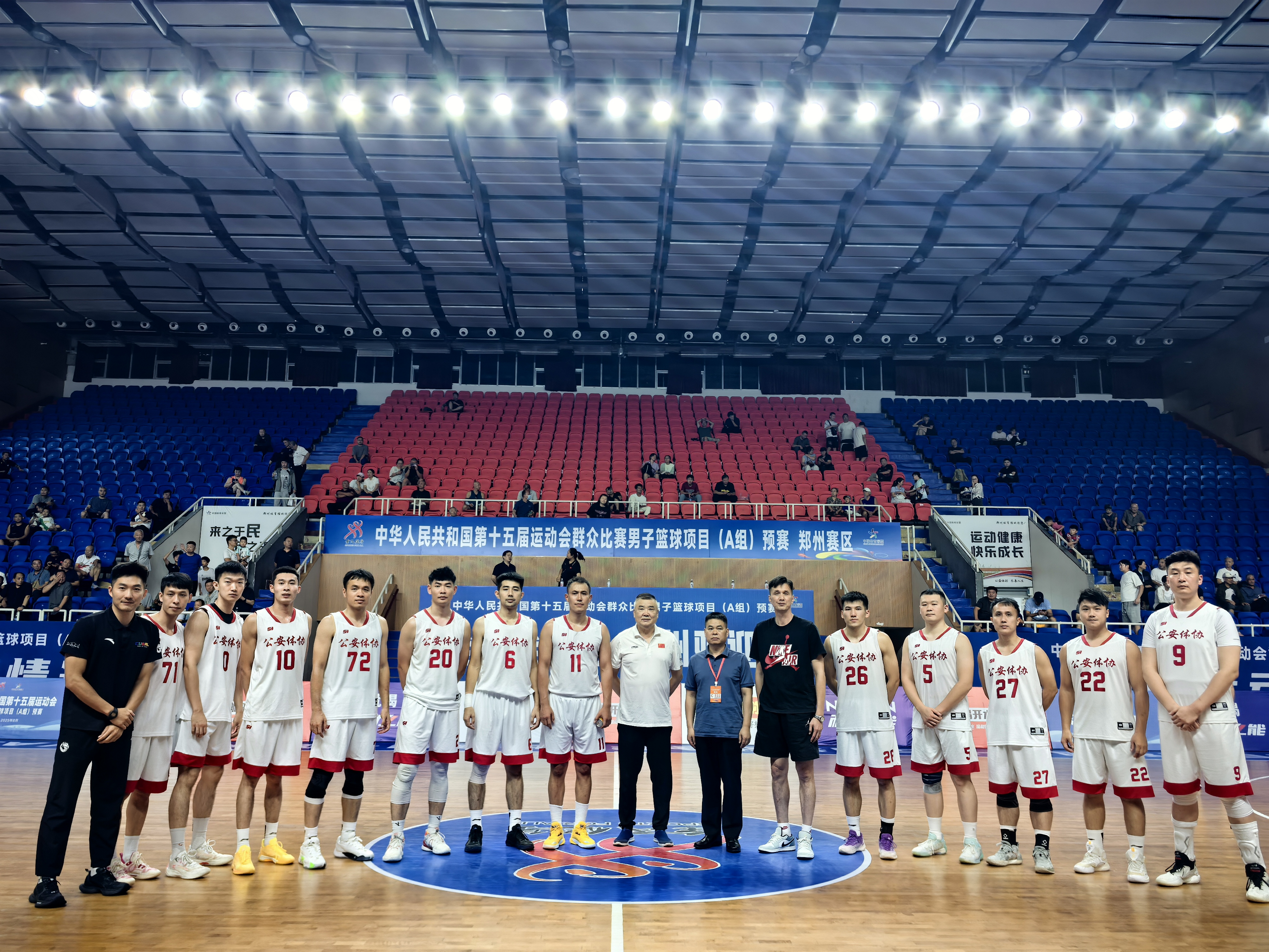 何鑫、乃盛业、韦宝宇代表公安部参加中华人民共和国第十五届运动会群众比赛男子篮球项目(A组)(左一何鑫、左五乃盛业、左七韦宝宇)