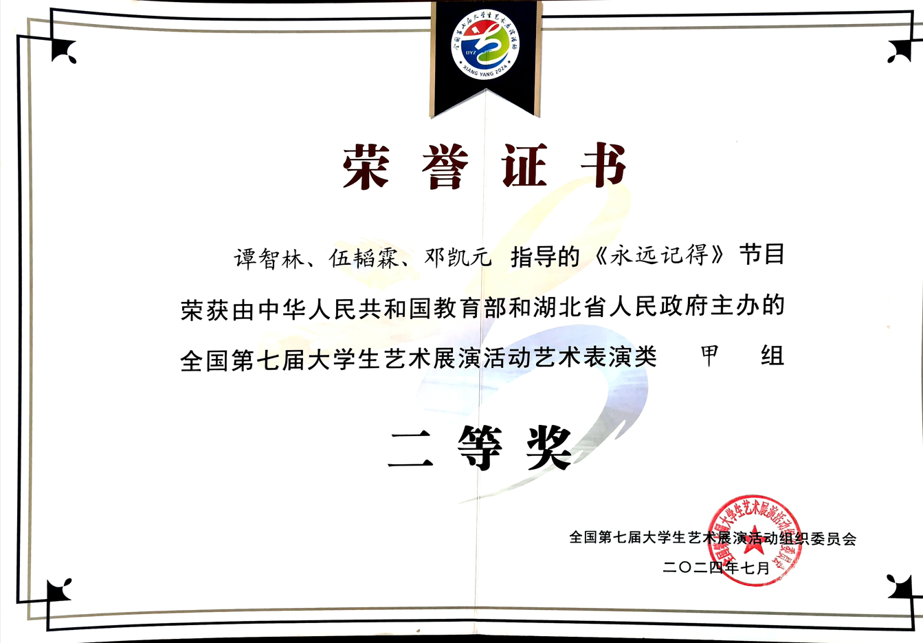 在广西第七届大学生艺术展演中实现历史性突破,斩获一等奖5项、二等奖12项、三等奖4项,其中朗诵作品《永远记得》荣获全国第七届大学生艺术展演二等奖,充分展现学校美育育人成效。